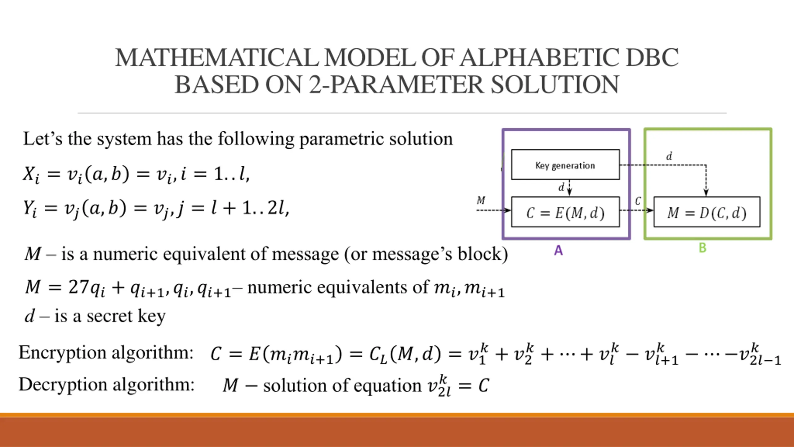 MATHEMATICAL MODEL OF ALPHABETIC DBC BASED ON 2-PARAMETER SOLUTION Let s the system has the following parametric solution ??= ???,? = ??,? = 1..?, ??= ???,? = ??,? = ? + 1..2?, M is a numeric equivalent of message (or message s block) ? = 27??+ ??+1,??,??+1 numeric equivalents of ??,??+1 d is a secret key Encryption algorithm: Decryption algorithm: ? ??+1 ? ? ?+ ?2 ?+ + ?? ? = ? ????+1 = ???,? = ?1 ? solution of equation ?2? ?2? 1 ?= ?
