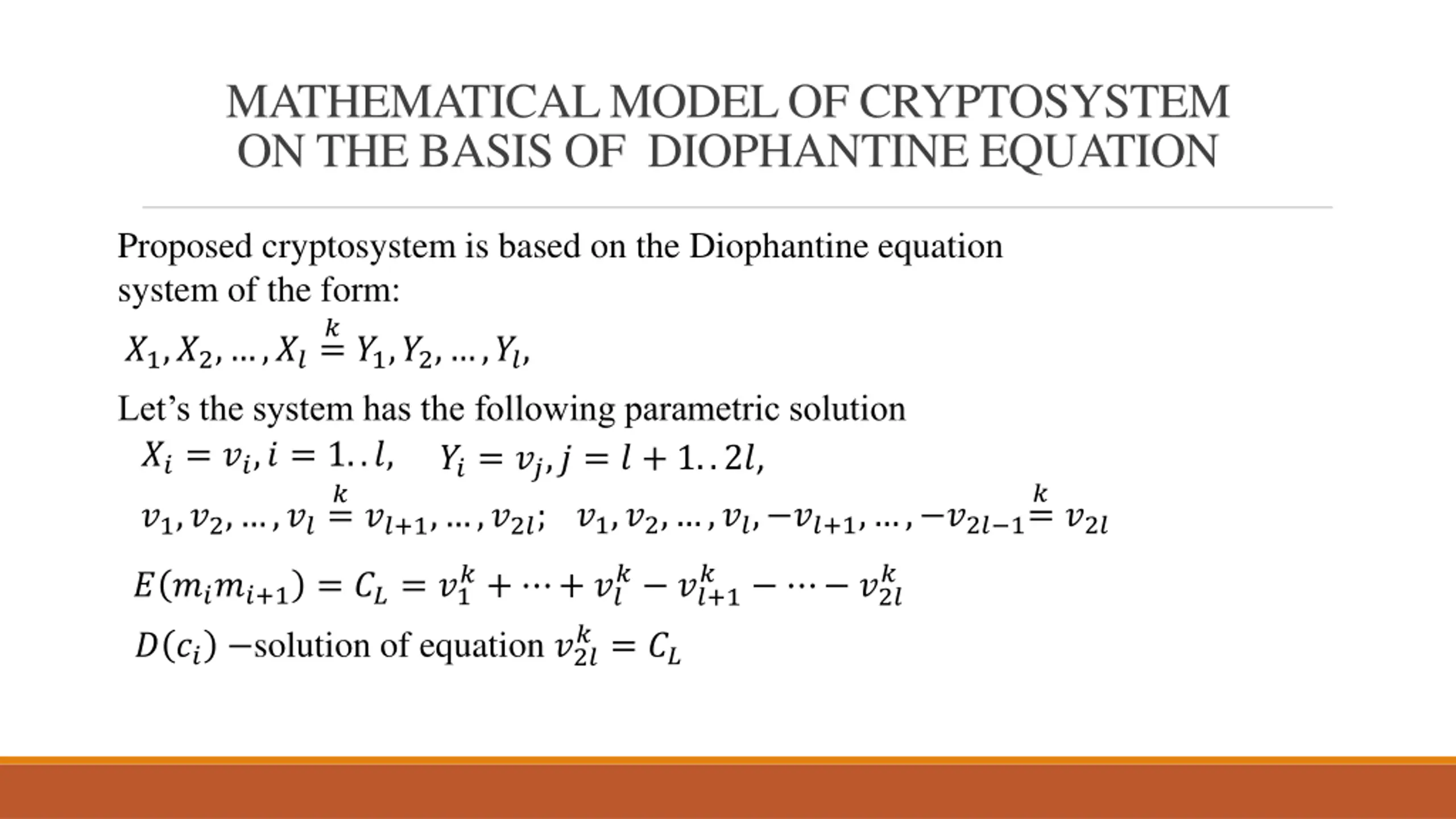MATHEMATICAL MODEL OF CRYPTOSYSTEM ON THE BASIS OF DIOPHANTINE EQUATION Proposed cryptosystem is based on the Diophantine equation system of the form: ??1,?2, ,??, ?1,?2, ,??= Let s the system has the following parametric solution ??= ??,? = 1..?, ??= ??,? = ? + 1..2?, ???+1, ,?2?; ?1,?2, ,??, ??+1, , ?2? 1= ??2? ?1,?2, ,??= ? ??+1 ?= ?? ? ? ?+ + ?? ? ????+1 = ??= ?1 ? ?? solution of equation ?2? ?2?