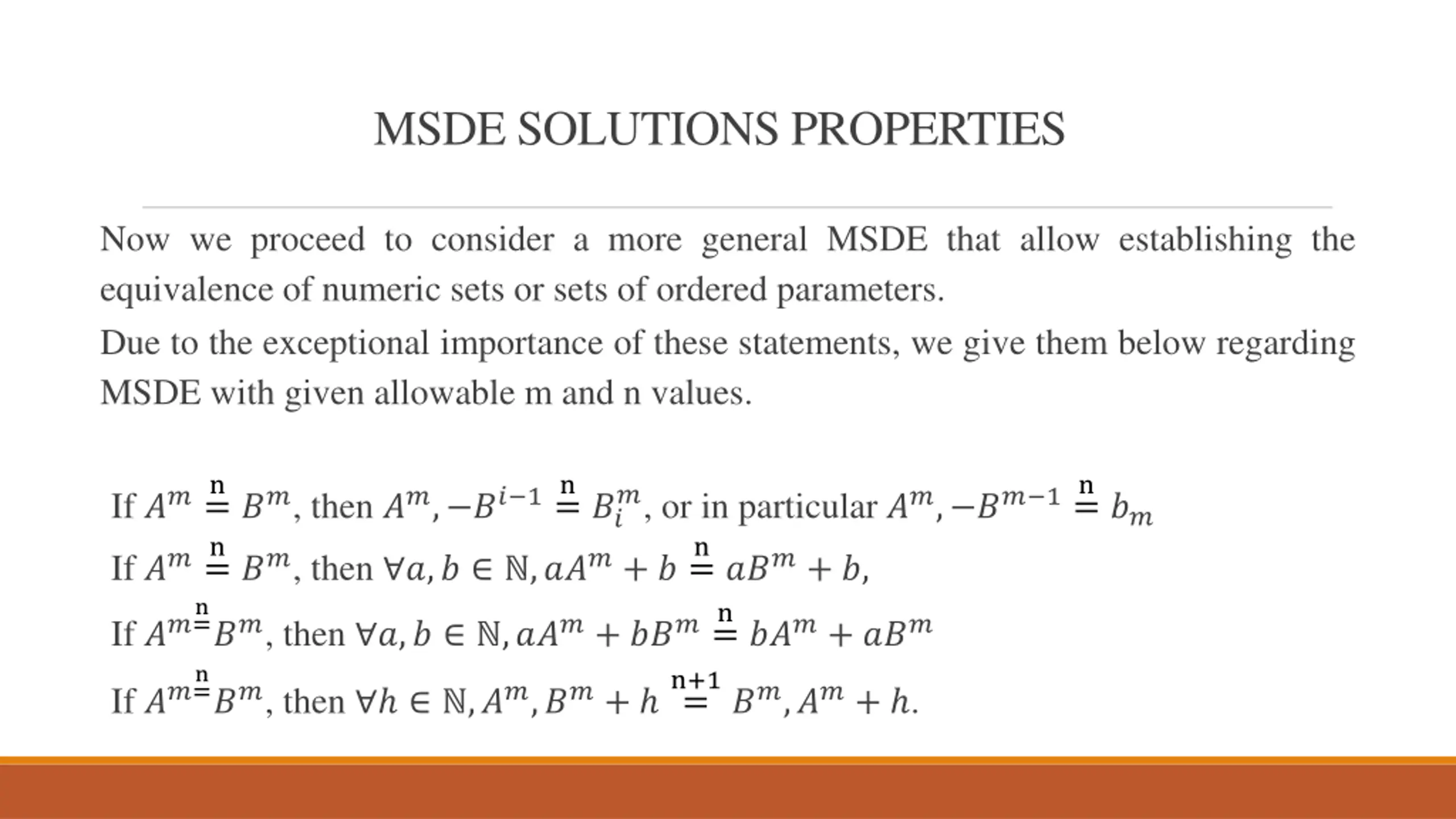 MSDE SOLUTIONS PROPERTIES Now we proceed to consider a more general MSDE that allow establishing the equivalence of numeric sets or sets of ordered parameters. Due to the exceptional importance of these statements, we give them below regarding MSDE with given allowable m and n values. n??, then ??, ?? 1= n??, then ?,? ,???+ ? = n??, then ?,? ,???+ ???= n??, then ,??,??+ = n?? n?? ?, or in particular ??, ?? 1= n???+ ?, n???+ ??? If ??= If ??= If ??= n+1??,??+ . If ??=
