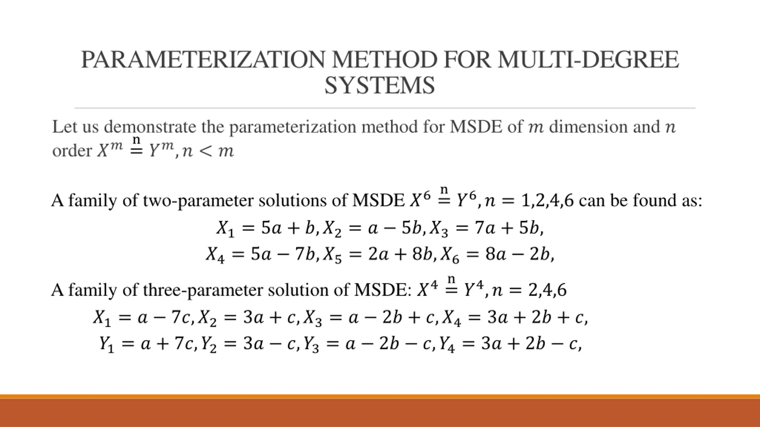 PARAMETERIZATION METHOD FOR MULTI-DEGREE SYSTEMS Let us demonstrate the parameterization method for MSDE of ? dimension and ? order ??= n??,? < ? n?6,? = 1,2,4,6 can be found as: A family of two-parameter solutions of MSDE ?6= ?1= 5? + ?,?2= ? 5?,?3= 7? + 5?, ?4= 5? 7?,?5= 2? + 8?,?6= 8? 2?, n?4,? = 2,4,6 A family of three-parameter solution of MSDE: ?4= ?1= ? 7?,?2= 3? + ?,?3= ? 2? + ?,?4= 3? + 2? + ?, ?1= ? + 7?,?2= 3? ?,?3= ? 2? ?,?4= 3? + 2? ?,