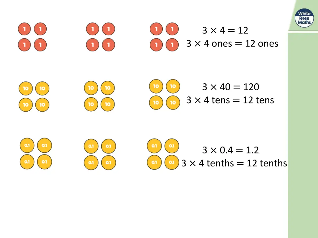 3 4 = 12 3 4 ones = 12 ones 3 40 = 120 3 4 tens = 12 tens 3 0.4 = 1.2 3 4 tenths = 12 tenths