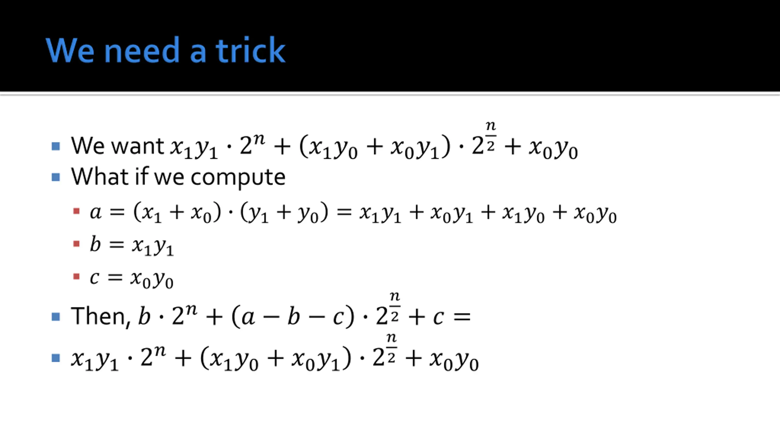Imagine that we're in base 2, because it keeps things simple I want to find the product ? ? We can break ? (and similarly ?) into high-order part ?1and low-order part ?0such that ? = ?1 2 ?1 2 ?1 2 ? 2+ ?0 ? 2+ ?0 ? 2+ ?0 ?? = ? 2+ ?0?0 = ?1?1 2?+ ?1?0+ ?0?1 2