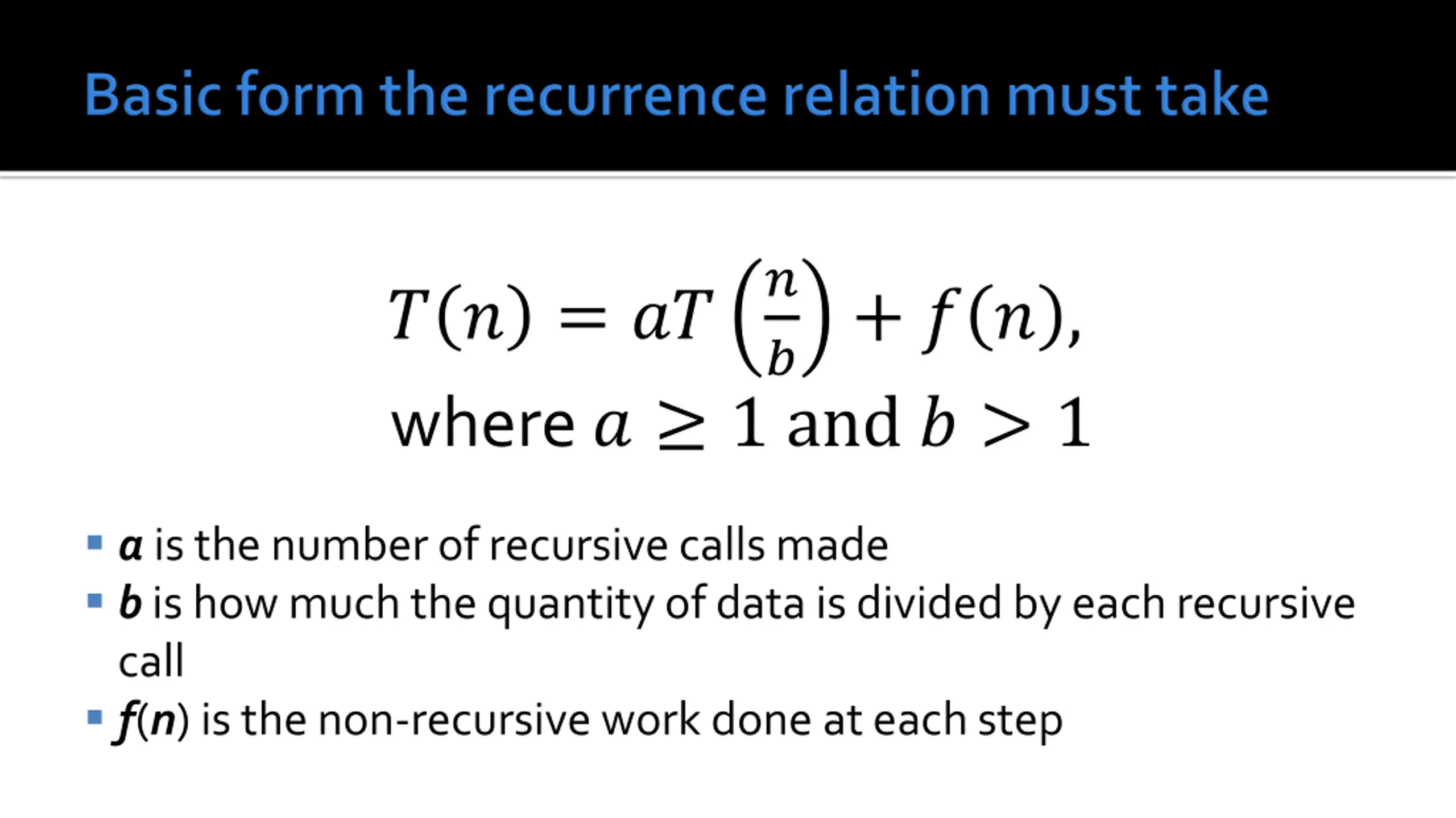 ? ?+ ? ? , ? ? = ?? where ? 1 and ? > 1 a is the number of recursive calls made b is how much the quantity of data is divided by each recursive call f(n) is the non-recursive work done at each step