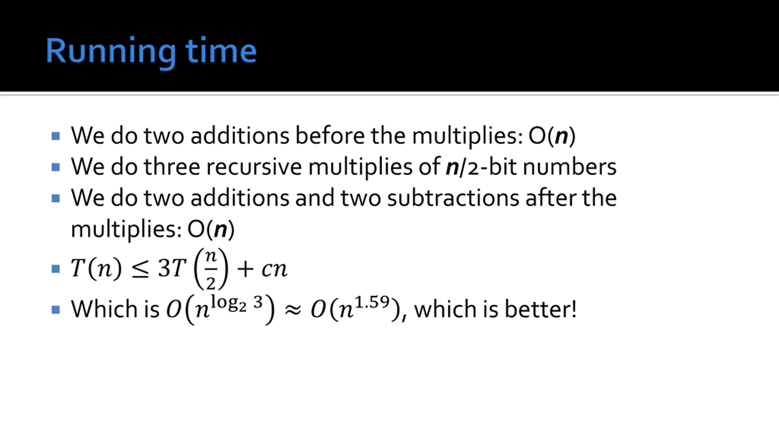 We do two additions before the multiplies: O(n) We do three recursive multiplies of n/2-bit numbers We do two additions and two subtractions after the multiplies: O(n) ? 2+ ?? Which is ? ?log23 ? ?1.59, which is better! ? ? 3?