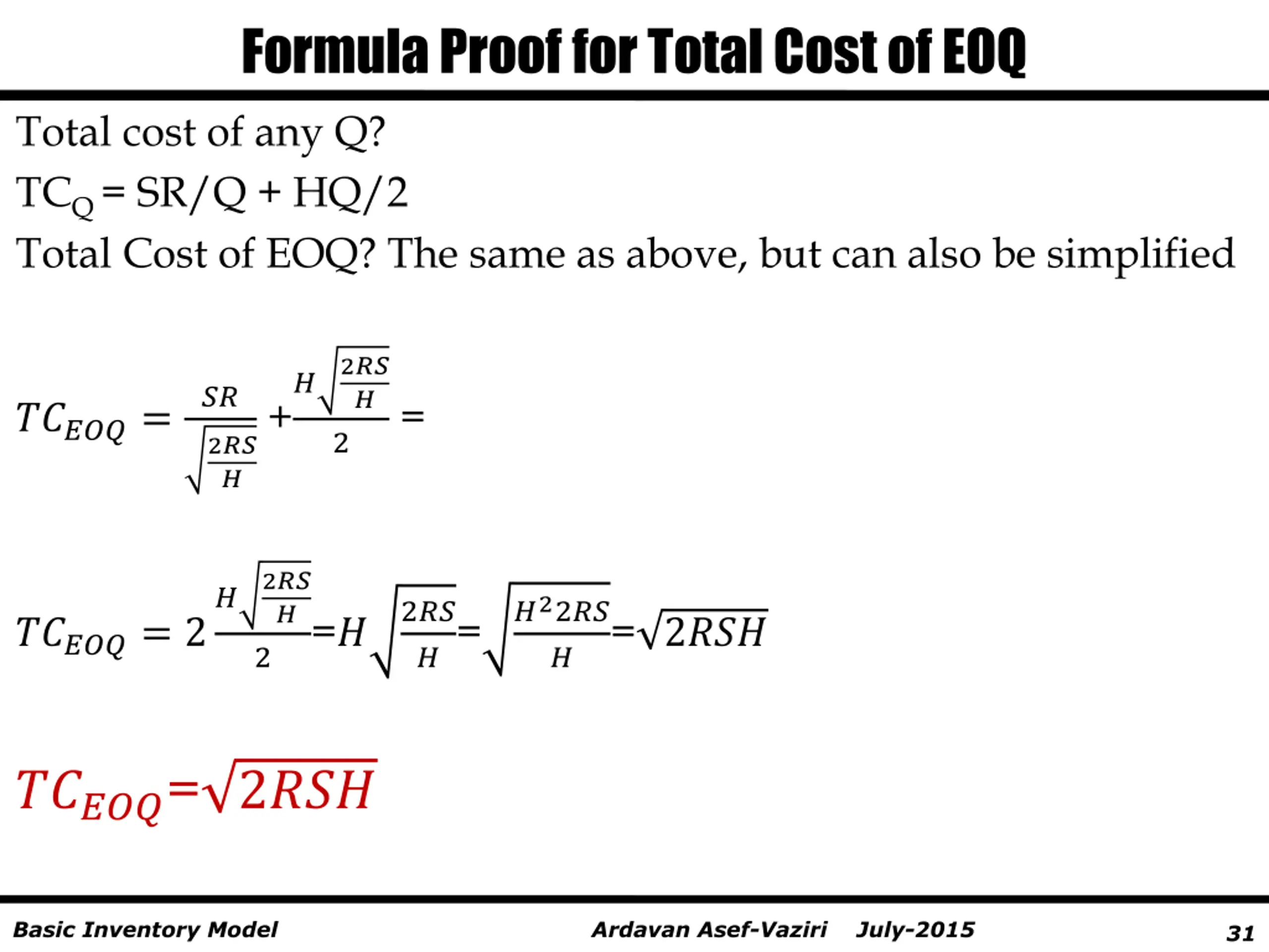 Formula Proof for Total Cost of EOQ Total cost of any Q? TCQ = SR/Q + HQ/2 Total Cost of EOQ? The same as above, but can also be simplified 2?? ? 2 ? ?? + = ?????= 2?? ? 2?? ? 2 ? ?22?? ? 2?? ?= =? = 2??? ?????= 2 ?????= 2??? Basic Inventory Model Ardavan Asef-Vaziri July-2015 31