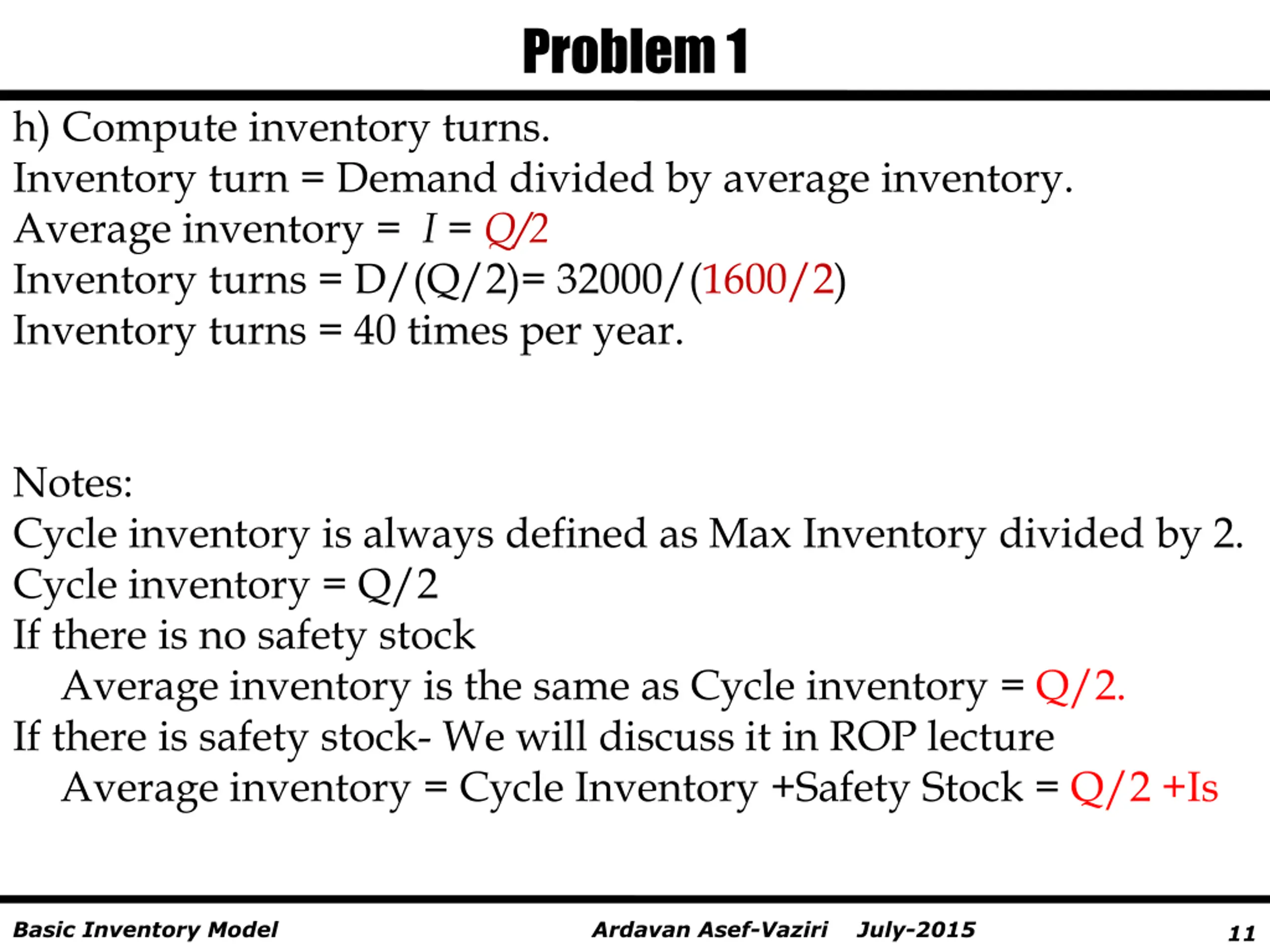 Problem 1 h) Compute inventory turns. Inventory turn = Demand divided by average inventory. Average inventory = I = Q/2 Inventory turns = D/(Q/2)= 32000/(1600/2) Inventory turns = 40 times per year. Notes: Cycle inventory is always defined as Max Inventory divided by 2. Cycle inventory = Q/2 If there is no safety stock Average inventory is the same as Cycle inventory = Q/2. If there is safety stock- We will discuss it in ROP lecture Average inventory = Cycle Inventory +Safety Stock = Q/2 +Is Basic Inventory Model Ardavan Asef-Vaziri July-2015 11