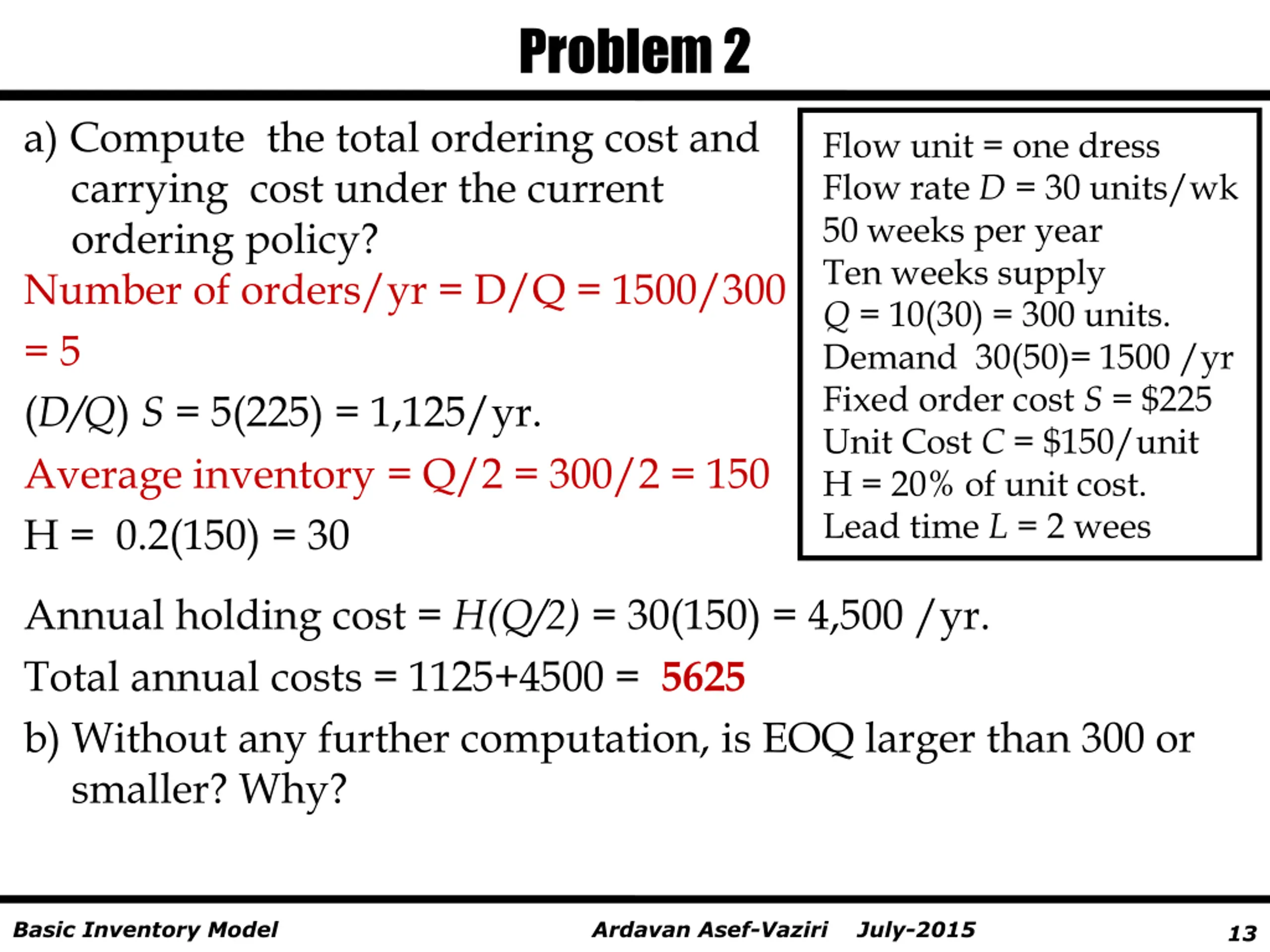 Problem 2 a) Compute the total ordering cost and carrying cost under the current ordering policy? Number of orders/yr = D/Q = 1500/300 = 5 (D/Q) S = 5(225) = 1,125/yr. Average inventory = Q/2 = 300/2 = 150 H = 0.2(150) = 30 Flow unit = one dress Flow rate D = 30 units/wk 50 weeks per year Ten weeks supply Q = 10(30) = 300 units. Demand 30(50)= 1500 /yr Fixed order cost S = $225 Unit Cost C = $150/unit H = 20% of unit cost. Lead time L = 2 wees Annual holding cost = H(Q/2) = 30(150) = 4,500 /yr. Total annual costs = 1125+4500 = 5625 b) Without any further computation, is EOQ larger than 300 or smaller? Why? Basic Inventory Model Ardavan Asef-Vaziri July-2015 13
