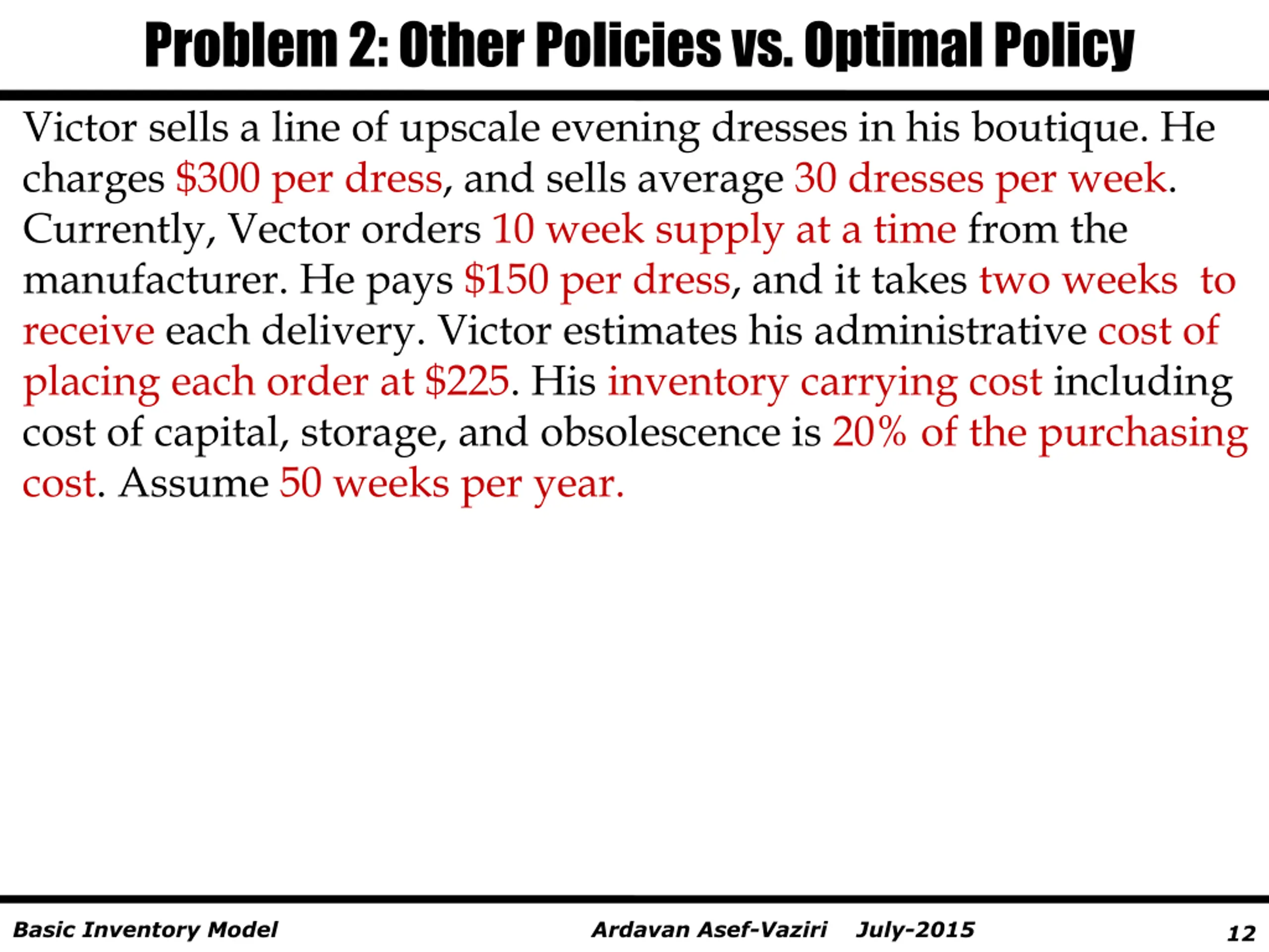 Problem 2: Other Policies vs. Optimal Policy Victor sells a line of upscale evening dresses in his boutique. He charges $300 per dress, and sells average 30 dresses per week. Currently, Vector orders 10 week supply at a time from the manufacturer. He pays $150 per dress, and it takes two weeks to receive each delivery. Victor estimates his administrative cost of placing each order at $225. His inventory carrying cost including cost of capital, storage, and obsolescence is 20% of the purchasing cost. Assume 50 weeks per year. Basic Inventory Model Ardavan Asef-Vaziri July-2015 12