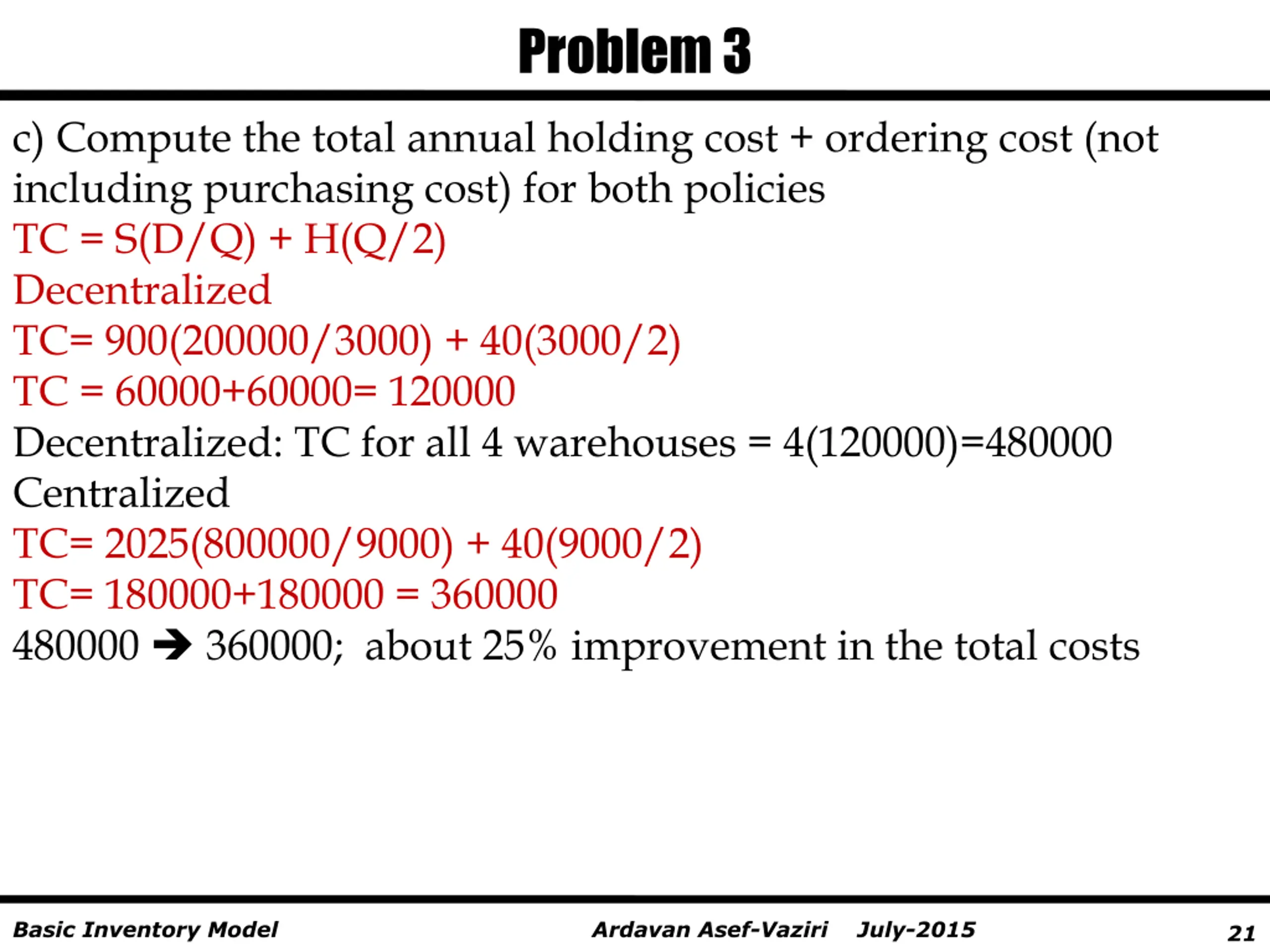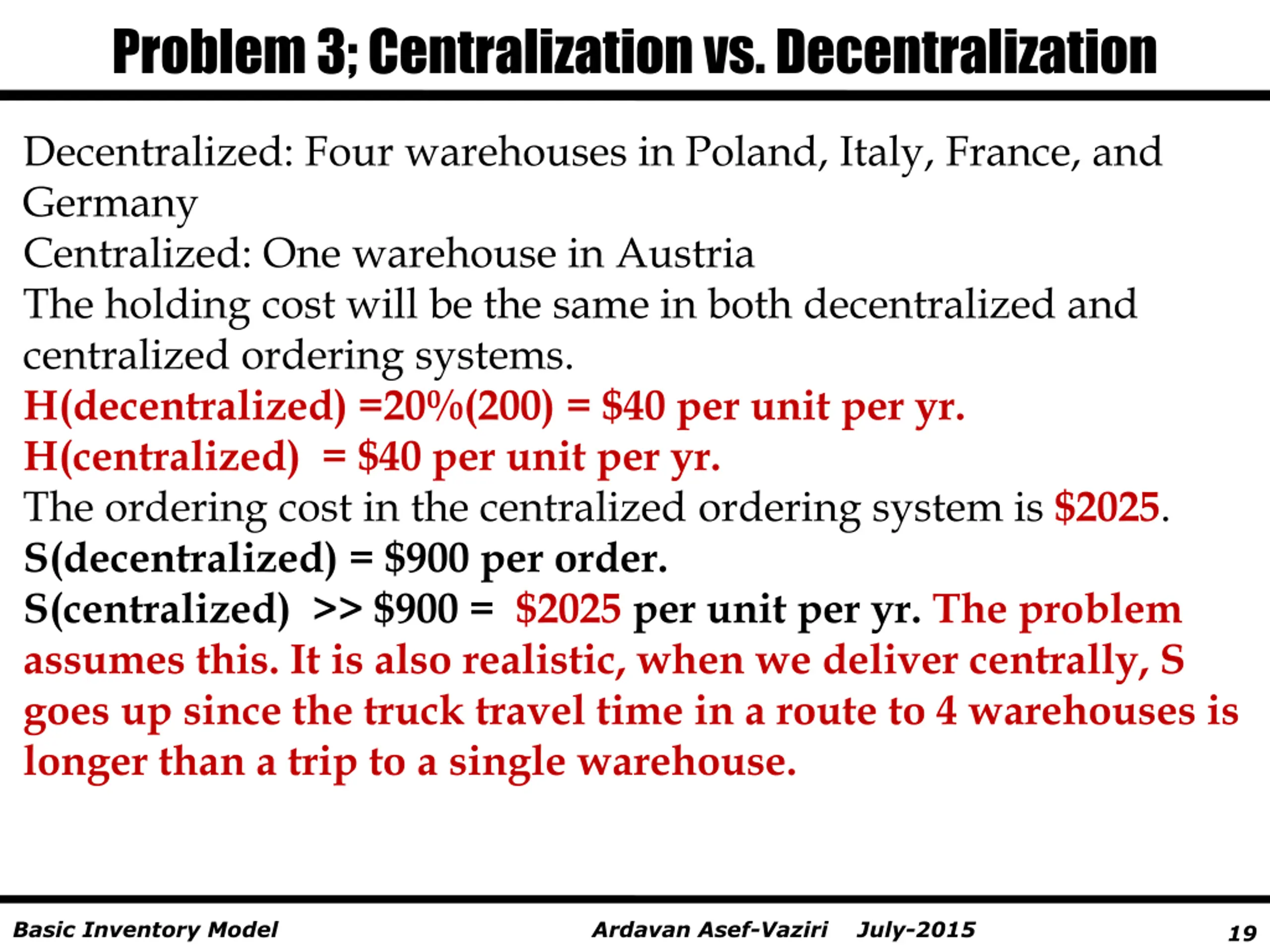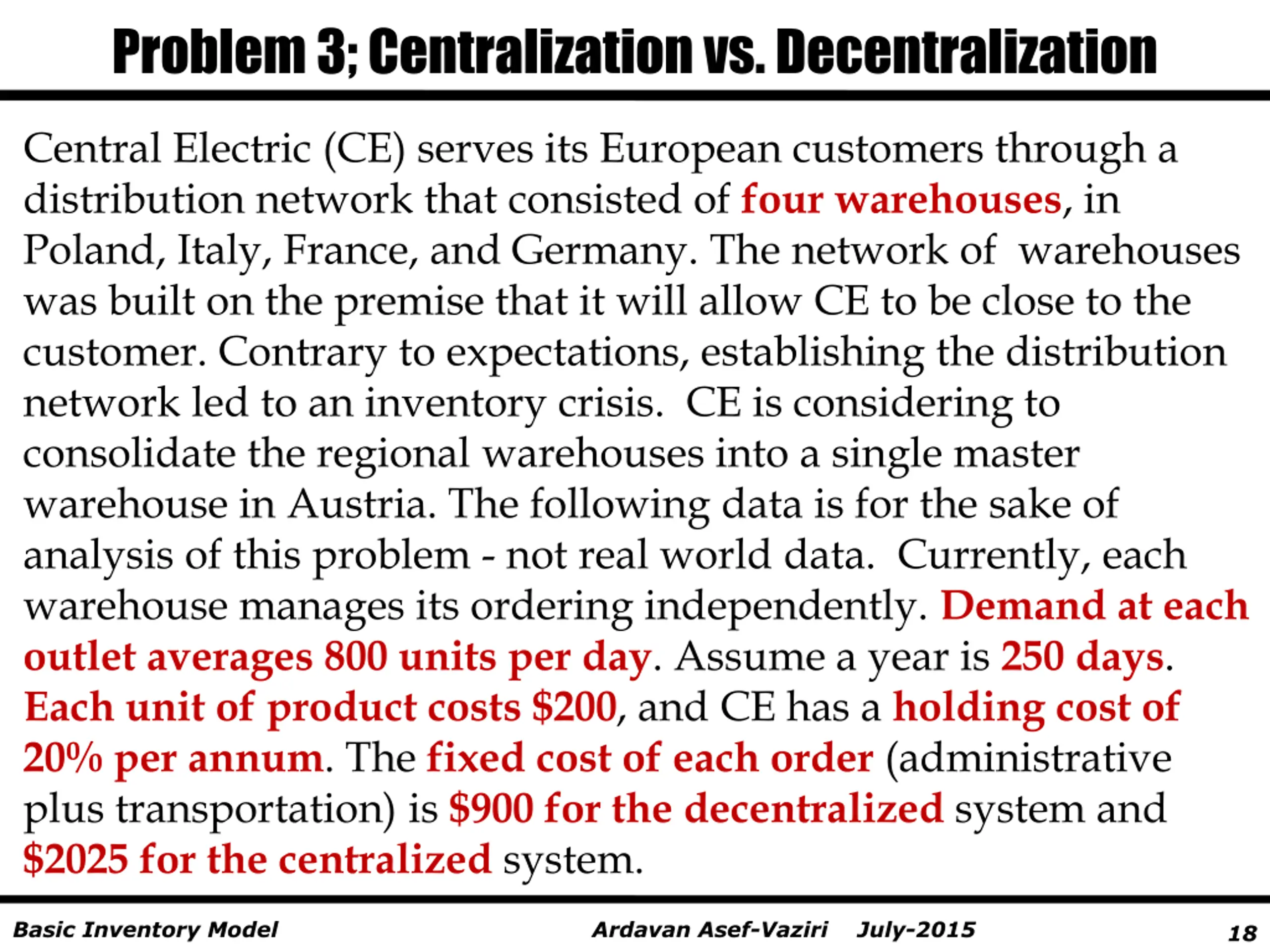 Problem 3; Centralization vs. Decentralization Central Electric (CE) serves its European customers through a distribution network that consisted of four warehouses, in Poland, Italy, France, and Germany. The network of warehouses was built on the premise that it will allow CE to be close to the customer. Contrary to expectations, establishing the distribution network led to an inventory crisis. CE is considering to consolidate the regional warehouses into a single master warehouse in Austria. The following data is for the sake of analysis of this problem - not real world data. Currently, each warehouse manages its ordering independently. Demand at each outlet averages 800 units per day. Assume a year is 250 days. Each unit of product costs $200, and CE has a holding cost of 20% per annum. The fixed cost of each order (administrative plus transportation) is $900 for the decentralized system and $2025 for the centralized system. Basic Inventory Model Ardavan Asef-Vaziri July-2015 18