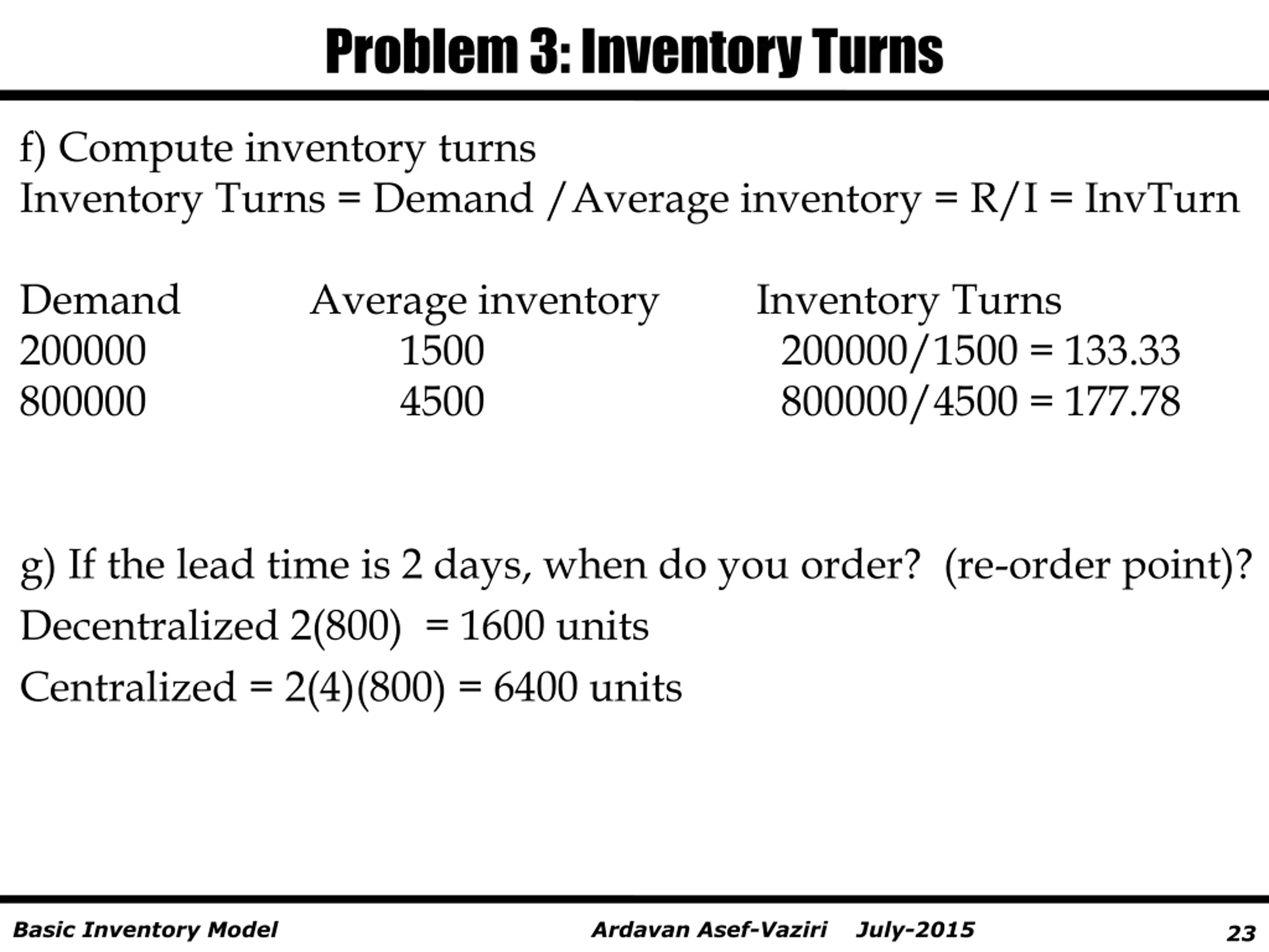 Problem 3: Inventory Turns f) Compute inventory turns Inventory Turns = Demand /Average inventory = R/I = InvTurn Demand Average inventory Inventory Turns 200000 1500 800000 4500 200000/1500 = 133.33 800000/4500 = 177.78 g) If the lead time is 2 days, when do you order? (re-order point)? Decentralized 2(800) = 1600 units Centralized = 2(4)(800) = 6400 units Basic Inventory Model Ardavan Asef-Vaziri July-2015 23