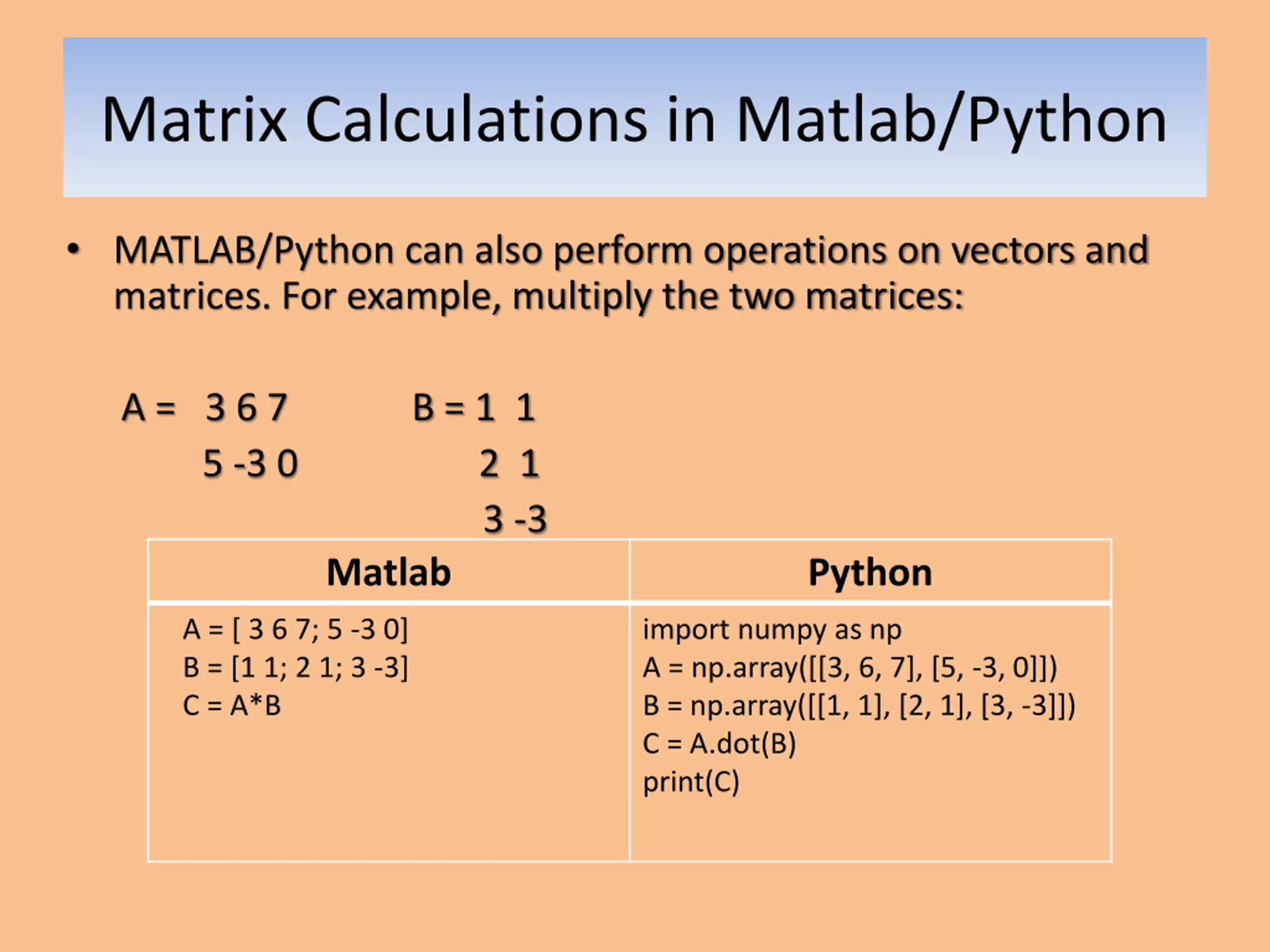 Matrix Calculations in Matlab/Python MATLAB/Python can also perform operations on vectors and matrices. For example, multiply the two matrices: A = 3 6 7 B = 1 1 5 -3 0 2 1 3 -3 Matlab Python A = [ 3 6 7; 5 -3 0] B = [1 1; 2 1; 3 -3] C = A*B import numpy as np A = np.array([[3, 6, 7], [5, -3, 0]]) B = np.array([[1, 1], [2, 1], [3, -3]]) C = A.dot(B) print(C)
