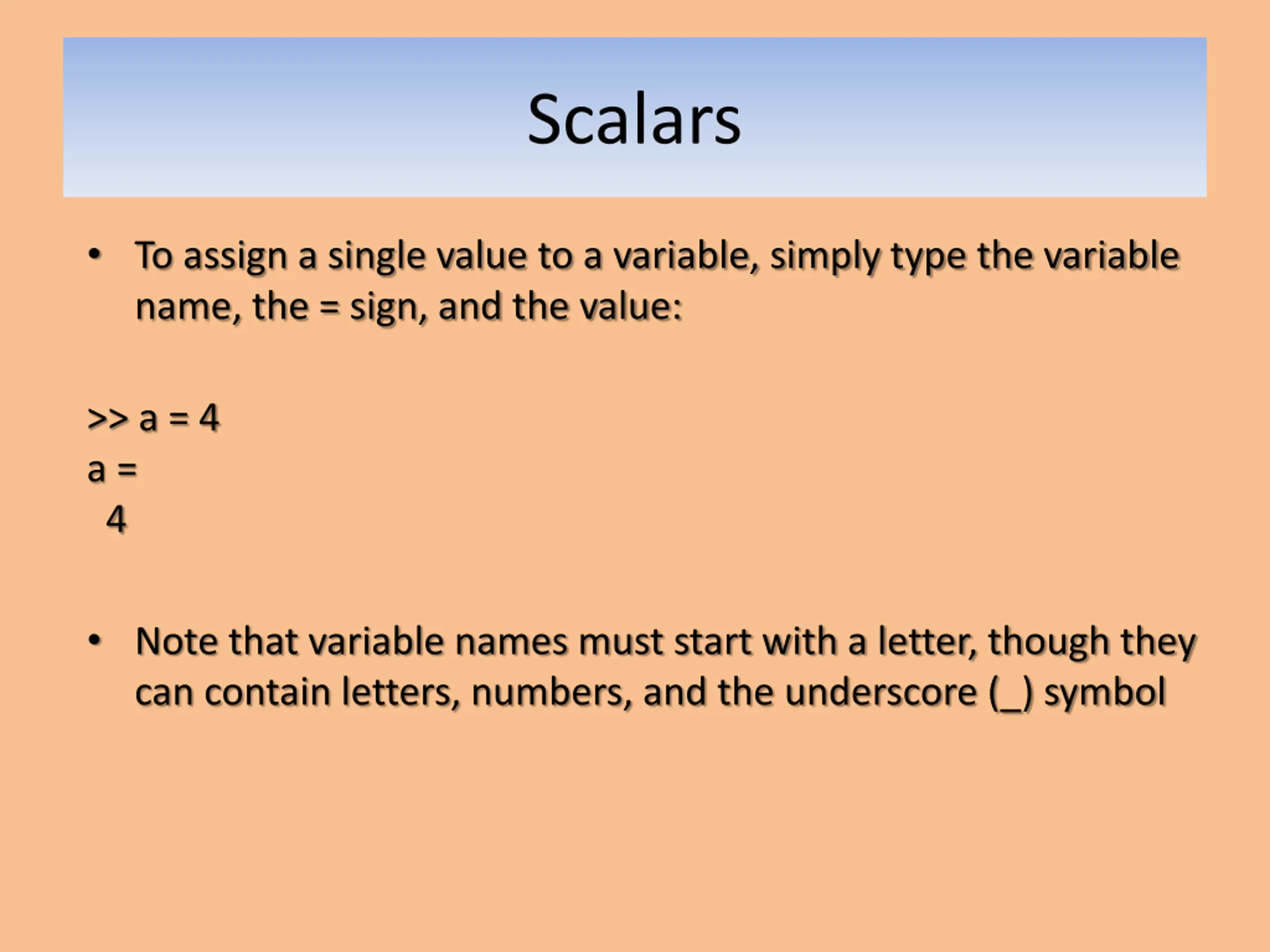 Scalars To assign a single value to a variable, simply type the variable name, the = sign, and the value: >> a = 4 a = 4 Note that variable names must start with a letter, though they can contain letters, numbers, and the underscore (_) symbol