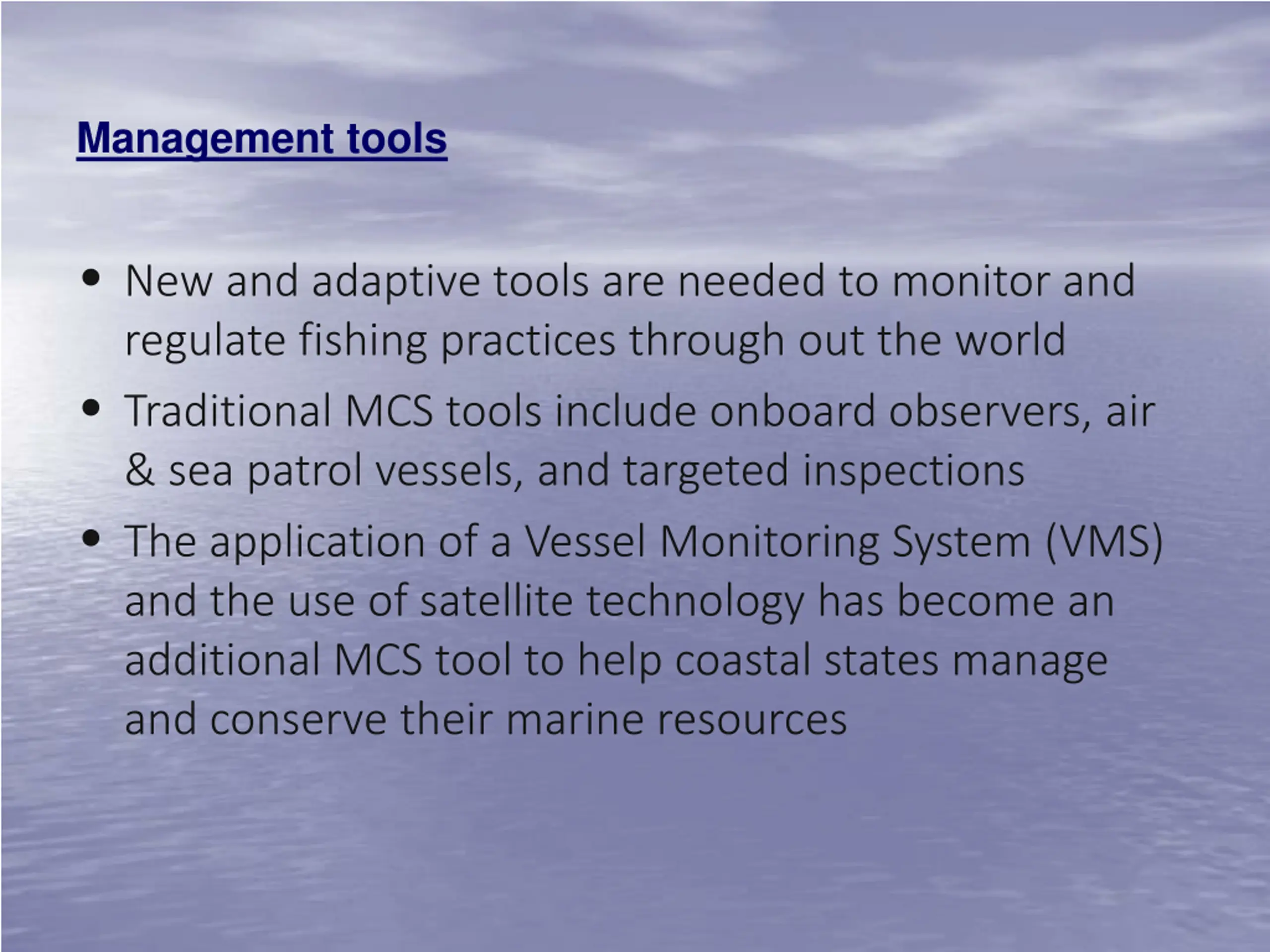Management tools New and adaptive tools are needed to monitor and regulate fishing practices through out the world Traditional MCS tools include onboard observers, air & sea patrol vessels, and targeted inspections The application of a Vessel Monitoring System (VMS) and the use of satellite technology has become an additional MCS tool to help coastal states manage and conserve their marine resources