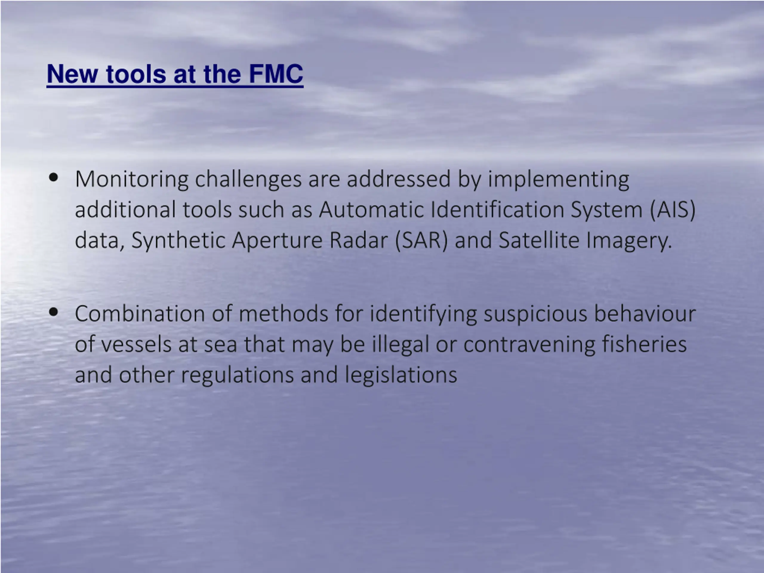 New tools at the FMC Monitoring challenges are addressed by implementing additional tools such as Automatic Identification System (AIS) data, Synthetic Aperture Radar (SAR) and Satellite Imagery. Combination of methods for identifying suspicious behaviour of vessels at sea that may be illegal or contravening fisheries and other regulations and legislations