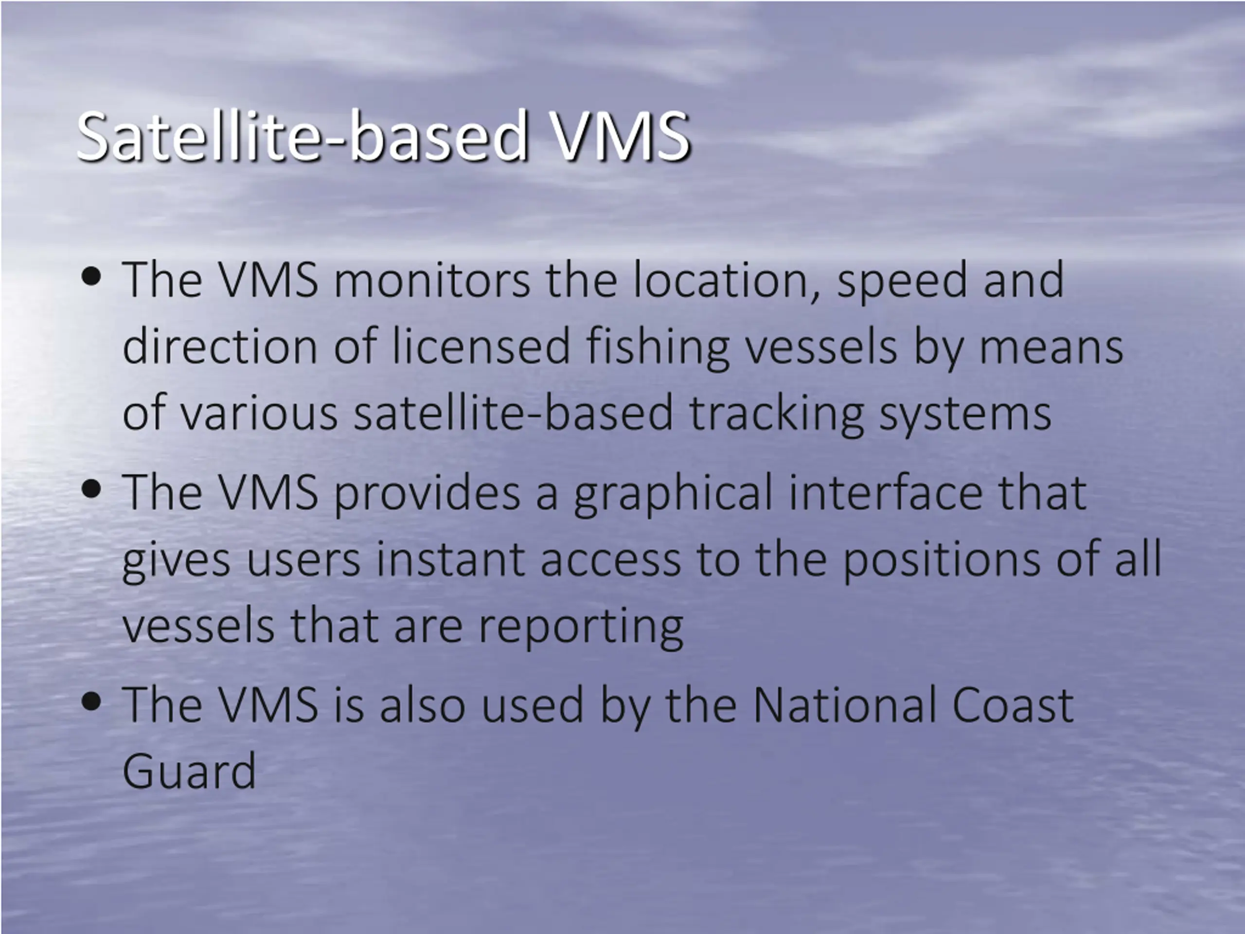 Satellite-based VMS The VMS monitors the location, speed and direction of licensed fishing vessels by means of various satellite-based tracking systems The VMS provides a graphical interface that gives users instant access to the positions of all vessels that are reporting The VMS is also used by the National Coast Guard