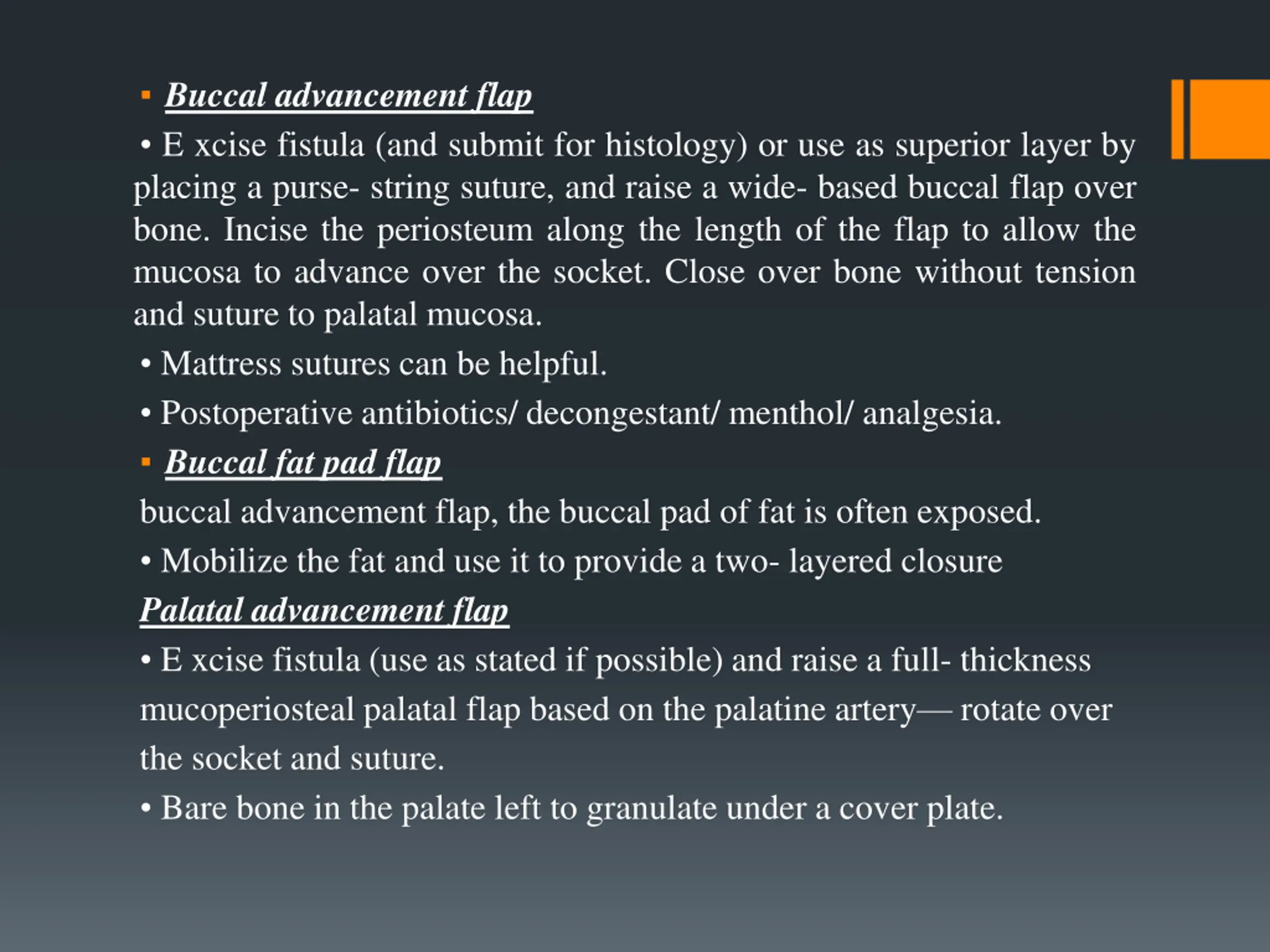 Buccal advancement flap E xcise fistula (and submit for histology) or use as superior layer by placing a purse- string suture, and raise a wide- based buccal flap over bone. Incise the periosteum along the length of the flap to allow the mucosa to advance over the socket. Close over bone without tension and suture to palatal mucosa. Mattress sutures can be helpful. Postoperative antibiotics/ decongestant/ menthol/ analgesia. Buccal fat pad flap buccal advancement flap, the buccal pad of fat is often exposed. Mobilize the fat and use it to provide a two- layered closure Palatal advancement flap E xcise fistula (use as stated if possible) and raise a full- thickness mucoperiosteal palatal flap based on the palatine artery rotate over the socket and suture. Bare bone in the palate left to granulate under a cover plate.