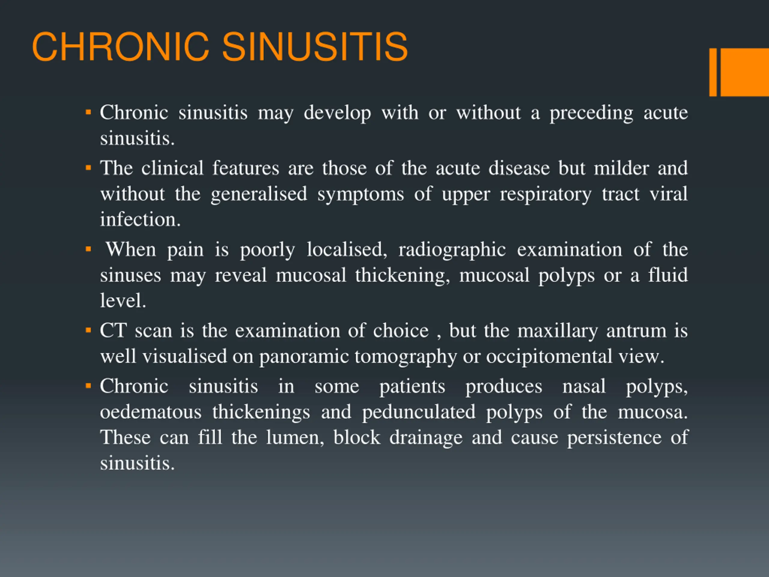 CHRONIC SINUSITIS Chronic sinusitis may develop with or without a preceding acute sinusitis. The clinical features are those of the acute disease but milder and without the generalised symptoms of upper respiratory tract viral infection. When pain is poorly localised, radiographic examination of the sinuses may reveal mucosal thickening, mucosal polyps or a fluid level. CT scan is the examination of choice , but the maxillary antrum is well visualised on panoramic tomography or occipitomental view. Chronic sinusitis in some patients produces nasal polyps, oedematous thickenings and pedunculated polyps of the mucosa. These can fill the lumen, block drainage and cause persistence of sinusitis.
