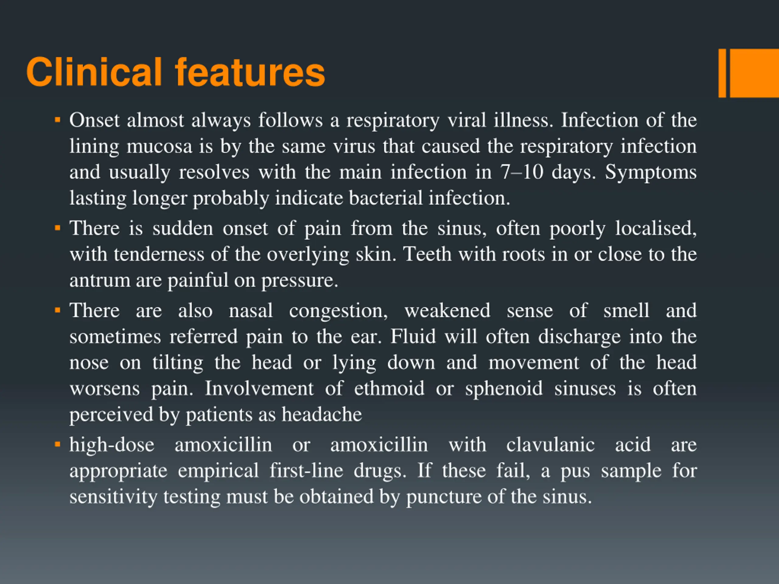 Clinical features Onset almost always follows a respiratory viral illness. Infection of the lining mucosa is by the same virus that caused the respiratory infection and usually resolves with the main infection in 7 10 days. Symptoms lasting longer probably indicate bacterial infection. There is sudden onset of pain from the sinus, often poorly localised, with tenderness of the overlying skin. Teeth with roots in or close to the antrum are painful on pressure. There are also nasal congestion, weakened sense of smell and sometimes referred pain to the ear. Fluid will often discharge into the nose on tilting the head or lying down and movement of the head worsens pain. Involvement of ethmoid or sphenoid sinuses is often perceived by patients as headache high-dose amoxicillin or amoxicillin with clavulanic acid are appropriate empirical first-line drugs. If these fail, a pus sample for sensitivity testing must be obtained by puncture of the sinus.