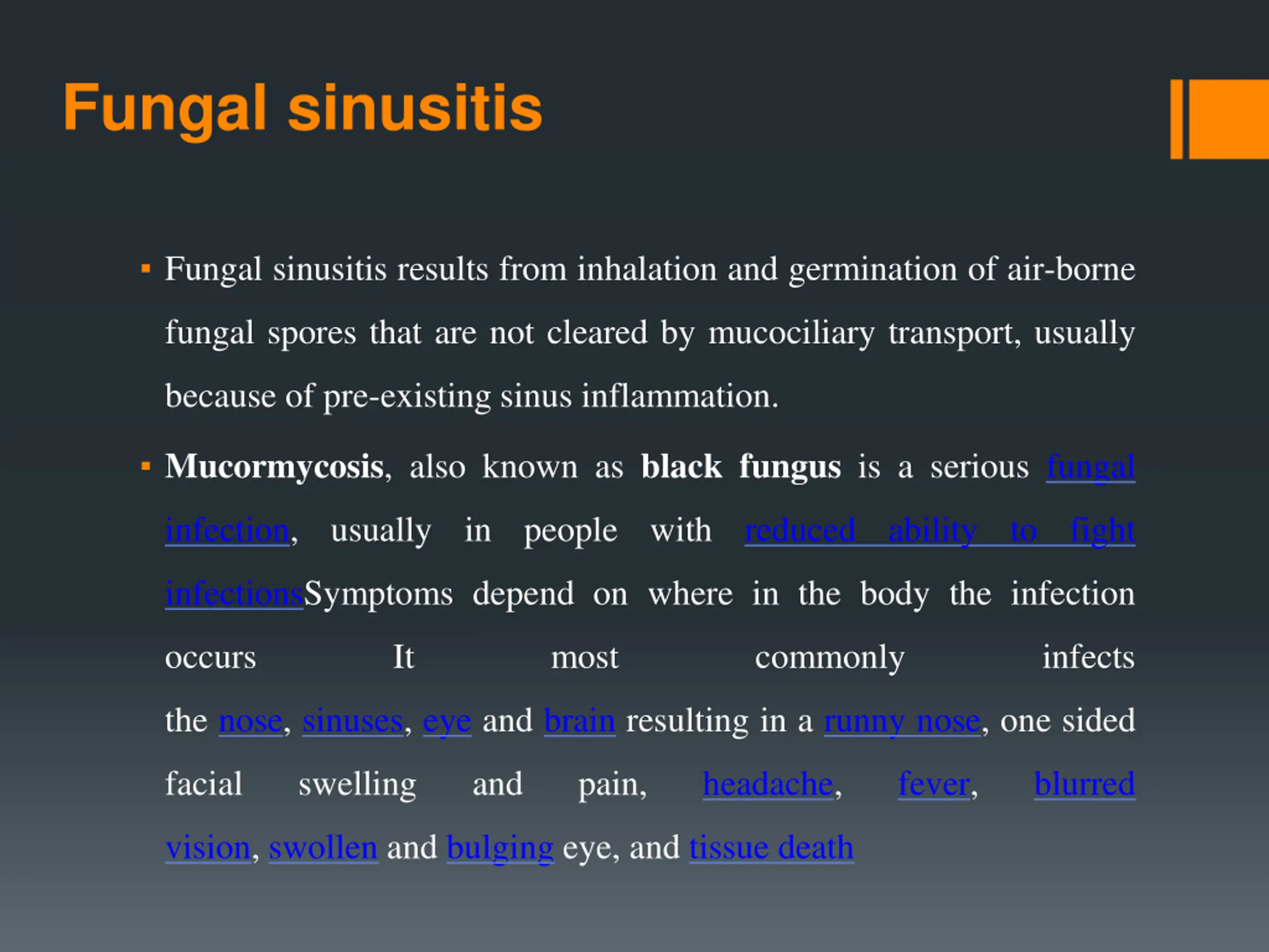 Fungal sinusitis Fungal sinusitis results from inhalation and germination of air-borne fungal spores that are not cleared by mucociliary transport, usually because of pre-existing sinus inflammation. Mucormycosis, also known as black fungus is a serious fungal infection, usually in people with reduced ability to fight infectionsSymptoms depend on where in the body the infection occurs It most commonly infects the nose, sinuses, eye and brain resulting in a runny nose, one sided facial swelling and pain, headache, fever, blurred vision, swollen and bulging eye, and tissue death
