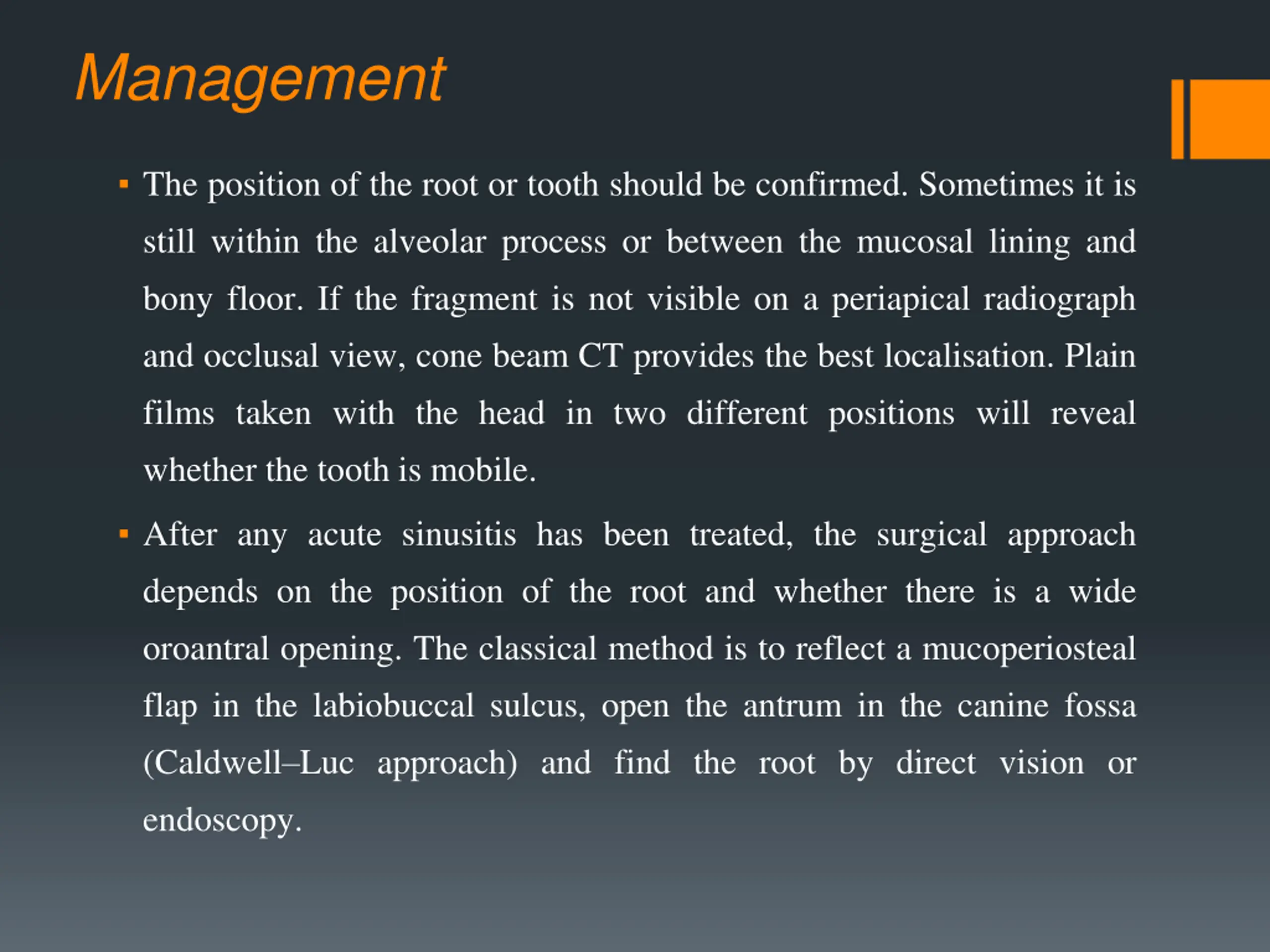 Management The position of the root or tooth should be confirmed. Sometimes it is still within the alveolar process or between the mucosal lining and bony floor. If the fragment is not visible on a periapical radiograph and occlusal view, cone beam CT provides the best localisation. Plain films taken with the head in two different positions will reveal whether the tooth is mobile. After any acute sinusitis has been treated, the surgical approach depends on the position of the root and whether there is a wide oroantral opening. The classical method is to reflect a mucoperiosteal flap in the labiobuccal sulcus, open the antrum in the canine fossa (Caldwell Luc approach) and find the root by direct vision or endoscopy.