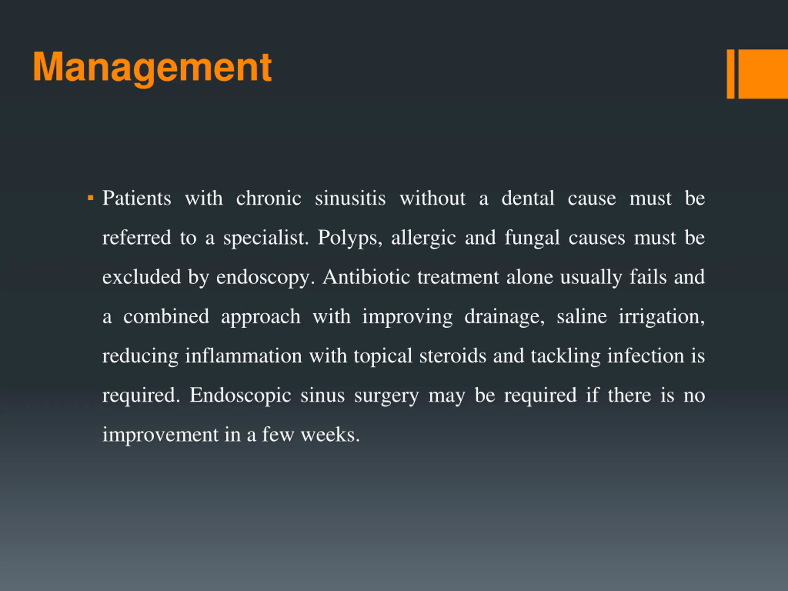 Management Patients with chronic sinusitis without a dental cause must be referred to a specialist. Polyps, allergic and fungal causes must be excluded by endoscopy. Antibiotic treatment alone usually fails and a combined approach with improving drainage, saline irrigation, reducing inflammation with topical steroids and tackling infection is required. Endoscopic sinus surgery may be required if there is no improvement in a few weeks.