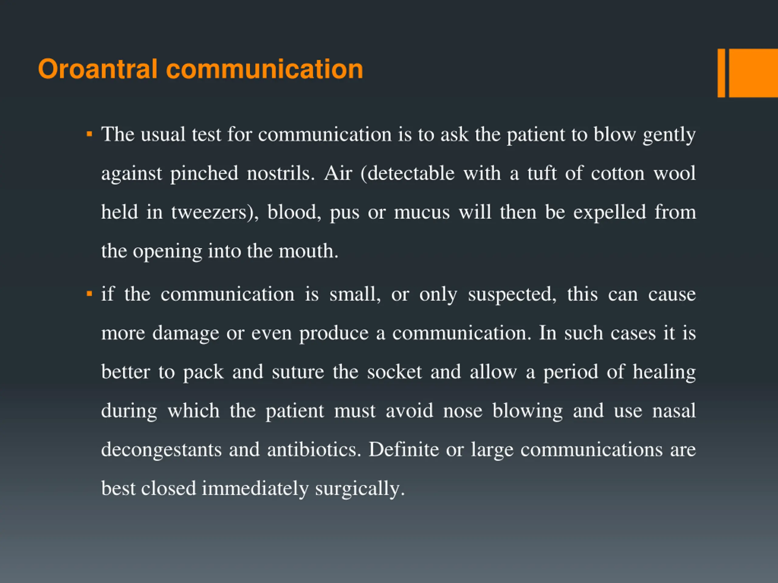 Oroantral communication The usual test for communication is to ask the patient to blow gently against pinched nostrils. Air (detectable with a tuft of cotton wool held in tweezers), blood, pus or mucus will then be expelled from the opening into the mouth. if the communication is small, or only suspected, this can cause more damage or even produce a communication. In such cases it is better to pack and suture the socket and allow a period of healing during which the patient must avoid nose blowing and use nasal decongestants and antibiotics. Definite or large communications are best closed immediately surgically.