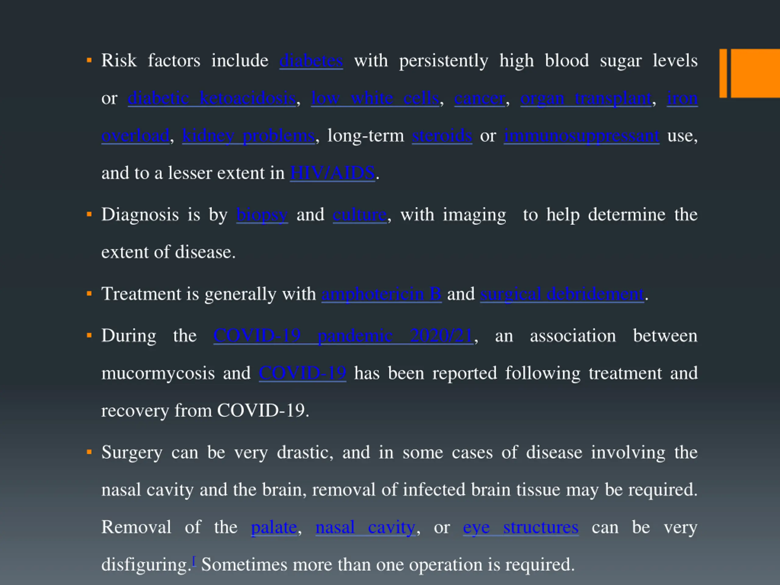 Risk factors include diabetes with persistently high blood sugar levels or diabetic ketoacidosis, low white cells, cancer, organ transplant, iron overload, kidney problems, long-term steroids or immunosuppressant use, and to a lesser extent in HIV/AIDS. Diagnosis is by biopsy and culture, with imaging to help determine the extent of disease. Treatment is generally with amphotericin B and surgical debridement. During the COVID-19 pandemic 2020/21, an association between mucormycosis and COVID-19 has been reported following treatment and recovery from COVID-19. Surgery can be very drastic, and in some cases of disease involving the nasal cavity and the brain, removal of infected brain tissue may be required. Removal of the palate, nasal cavity, or eye structures can be very disfiguring.[Sometimes more than one operation is required.