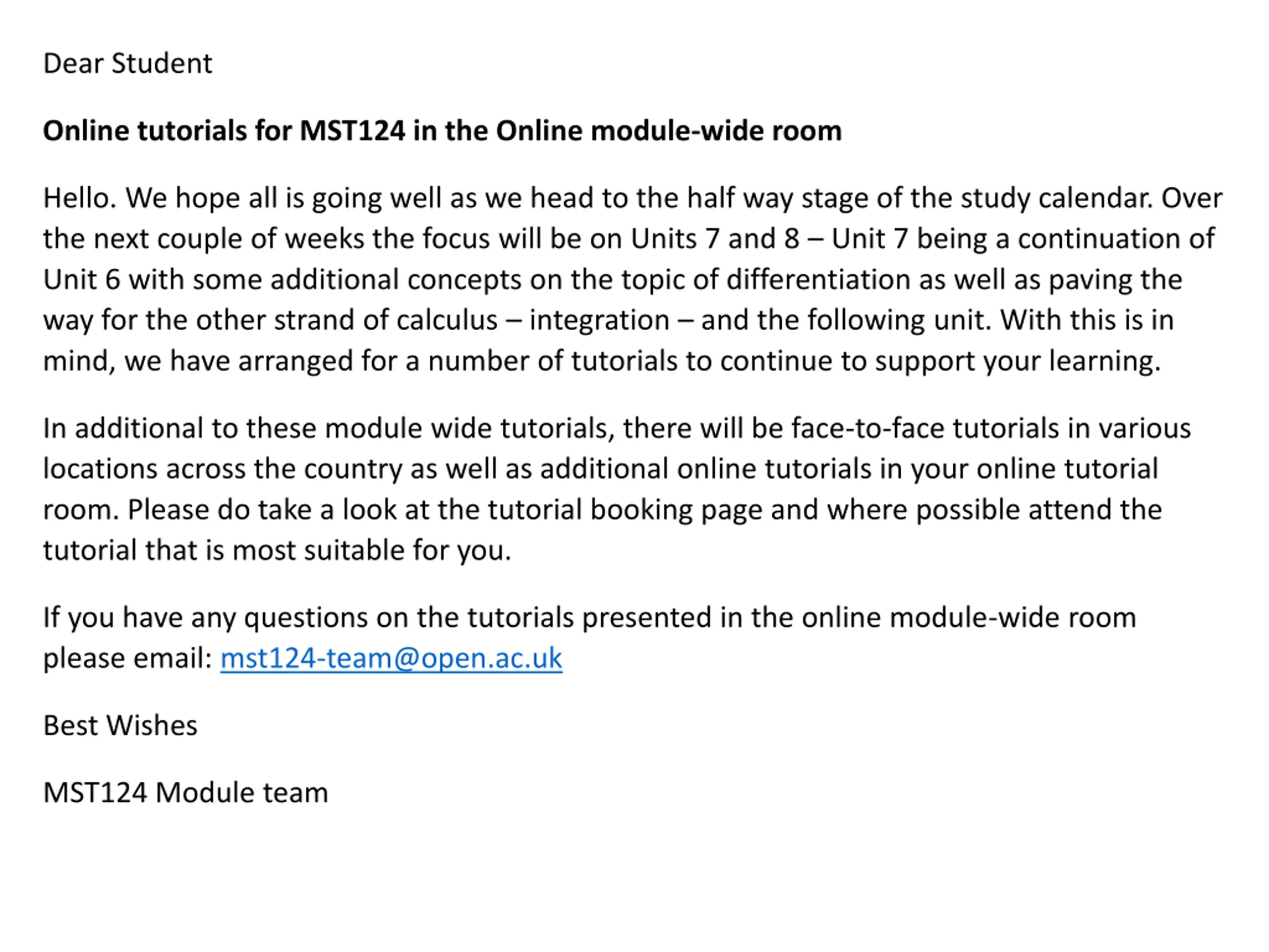 Dear Student Online tutorials for MST124 in the Online module-wide room Hello. We hope all is going well as we head to the half way stage of the study calendar. Over the next couple of weeks the focus will be on Units 7 and 8 Unit 7 being a continuation of Unit 6 with some additional concepts on the topic of differentiation as well as paving the way for the other strand of calculus integration and the following unit. With this is in mind, we have arranged for a number of tutorials to continue to support your learning. In additional to these module wide tutorials, there will be face-to-face tutorials in various locations across the country as well as additional online tutorials in your online tutorial room. Please do take a look at the tutorial booking page and where possible attend the tutorial that is most suitable for you. If you have any questions on the tutorials presented in the online module-wide room please email: mst124-team@open.ac.uk Best Wishes MST124 Module team