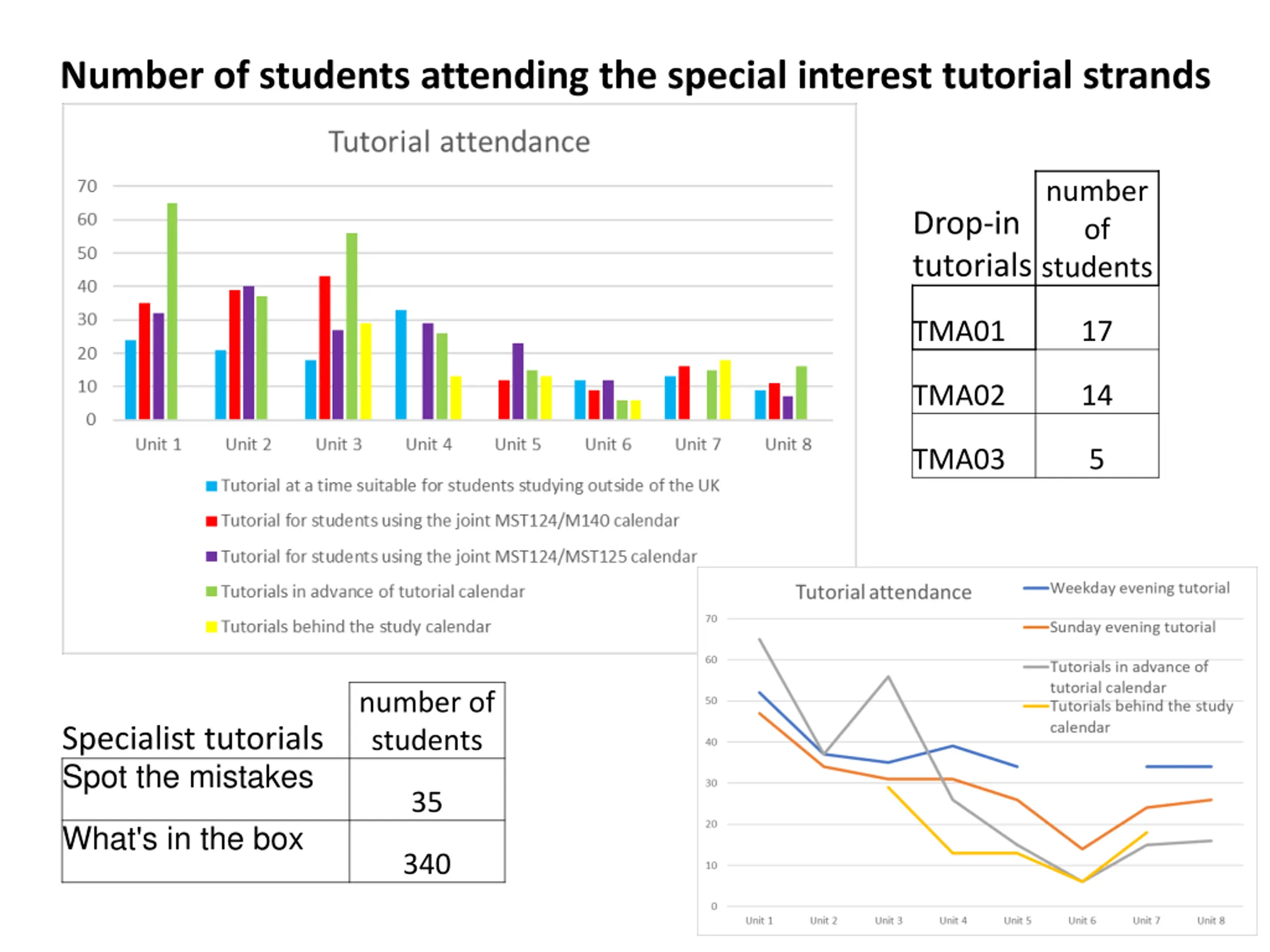 Number of students attending the special interest tutorial strands number of students Drop-in tutorials TMA01 17 TMA02 14 TMA03 5 number of students Specialist tutorials Spot the mistakes 35 What's in the box 340