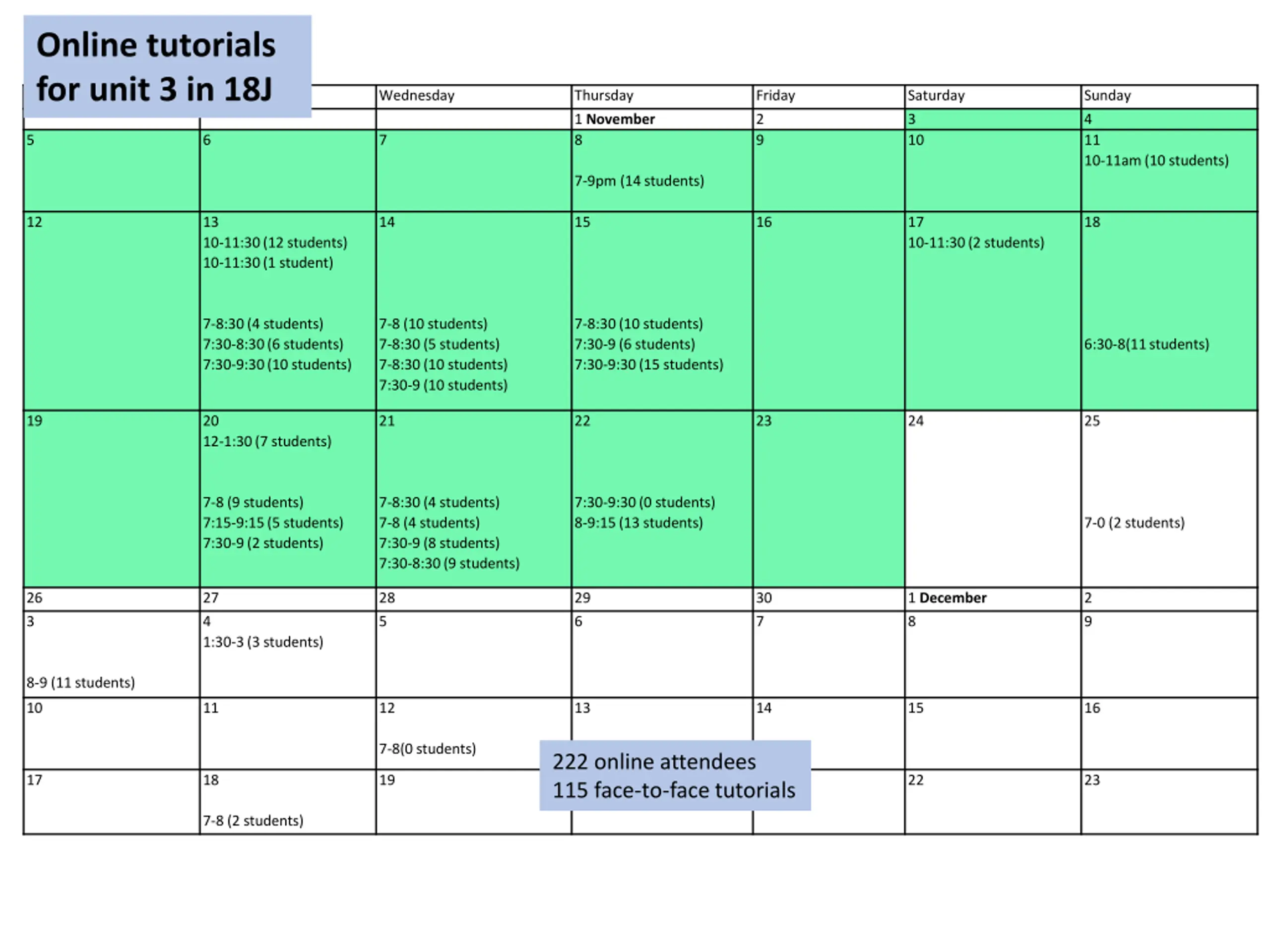 Online tutorials Monday for unit 3 in 18J Tuesday Wednesday Thursday 1 November 8 Friday 2 9 Saturday 3 10 Sunday 4 11 10-11am (10 students) 5 6 7 7-9pm (14 students) 12 13 10-11:30 (12 students) 10-11:30 (1 student) 14 15 16 17 10-11:30 (2 students) 18 7-8:30 (4 students) 7:30-8:30 (6 students) 7:30-9:30 (10 students) 7-8 (10 students) 7-8:30 (5 students) 7-8:30 (10 students) 7:30-9 (10 students) 7-8:30 (10 students) 7:30-9 (6 students) 7:30-9:30 (15 students) 6:30-8(11 students) 19 20 12-1:30 (7 students) 21 22 23 24 25 7-8 (9 students) 7:15-9:15 (5 students) 7:30-9 (2 students) 7-8:30 (4 students) 7-8 (4 students) 7:30-9 (8 students) 7:30-8:30 (9 students) 7:30-9:30 (0 students) 8-9:15 (13 students) 7-0 (2 students) 26 3 27 4 1:30-3 (3 students) 28 5 29 6 30 7 1 December 8 2 9 8-9 (11 students) 10 11 12 13 14 15 16 7-8(0 students) 222 online attendees 115 face-to-face tutorials 17 18 19 20 21 22 23 7-8 (2 students)