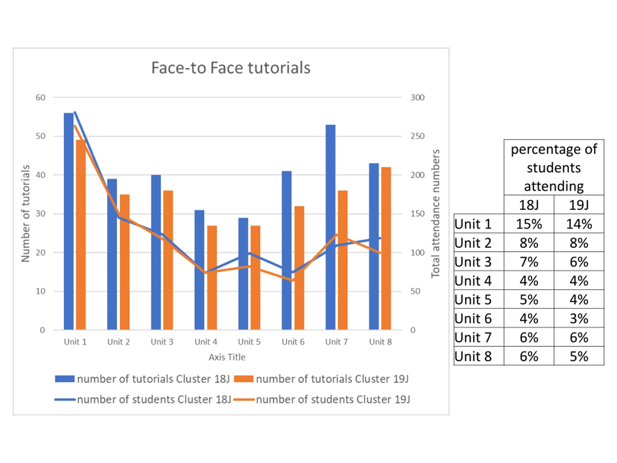 Total number of students attending both cluster and module-wide online tutorials total number of students 18J 370 282 272 161 161 139 154 130 percentage of students attending 18J 20% 15% 14% 9% 9% 7% 8% 7% 19J 584 466 521 283 278 197 209 211 19J 30% 24% 27% 15% 14% 10% 11% 11% Unit 1 Unit 2 Unit 3 Unit 4 Unit 5 Unit 6 Unit 7 Unit 8