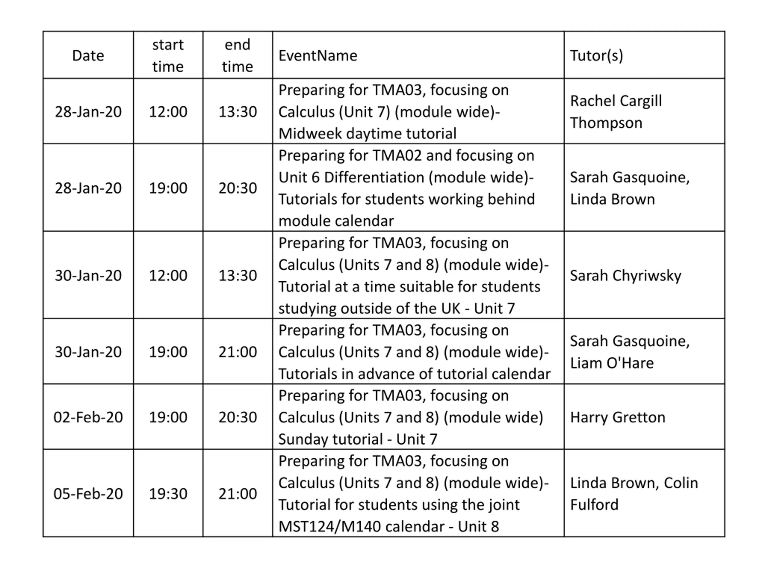start time end time Date EventName Tutor(s) Preparing for TMA03, focusing on Calculus (Unit 7) (module wide)- Midweek daytime tutorial Preparing for TMA02 and focusing on Unit 6 Differentiation (module wide)- Tutorials for students working behind module calendar Preparing for TMA03, focusing on Calculus (Units 7 and 8) (module wide)- Tutorial at a time suitable for students studying outside of the UK - Unit 7 Preparing for TMA03, focusing on Calculus (Units 7 and 8) (module wide)- Tutorials in advance of tutorial calendar Preparing for TMA03, focusing on Calculus (Units 7 and 8) (module wide) Sunday tutorial - Unit 7 Preparing for TMA03, focusing on Calculus (Units 7 and 8) (module wide)- Tutorial for students using the joint MST124/M140 calendar - Unit 8 Rachel Cargill Thompson 28-Jan-20 12:00 13:30 Sarah Gasquoine, Linda Brown 28-Jan-20 19:00 20:30 30-Jan-20 12:00 13:30 Sarah Chyriwsky Sarah Gasquoine, Liam O'Hare 30-Jan-20 19:00 21:00 02-Feb-20 19:00 20:30 Harry Gretton Linda Brown, Colin Fulford 05-Feb-20 19:30 21:00