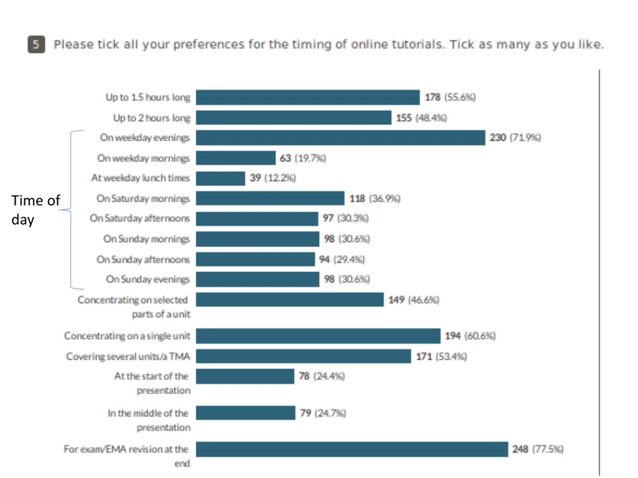 An anonymous survey containing 12 questions about the use of tuition time was sent out in May 2019 to approximately 2000 Maths & Stats OU undergraduate students. 334 responses were received in response to the survey. The questions focused on what the students thought the purpose of tuition time should be and how this time should best be used to support their learning. We also asked about practical issues such as length of tutorials, timing, whether to record online sessions and how easy it was to use the LEM booking system.