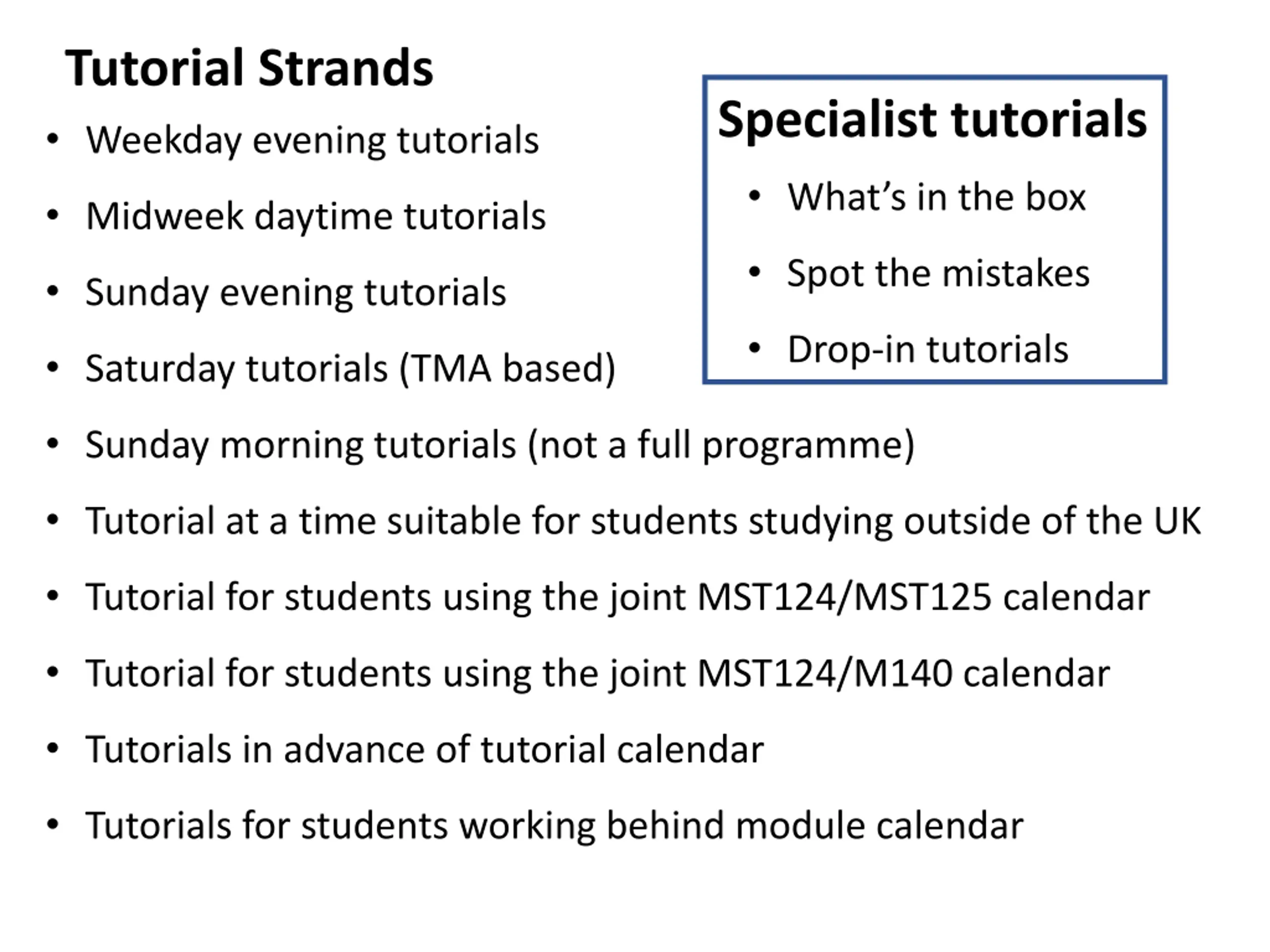 Tutorial Strands Weekday evening tutorials Specialist tutorials What s in the box Midweek daytime tutorials Spot the mistakes Sunday evening tutorials Drop-in tutorials Saturday tutorials (TMA based) Sunday morning tutorials (not a full programme) Tutorial at a time suitable for students studying outside of the UK Tutorial for students using the joint MST124/MST125 calendar Tutorial for students using the joint MST124/M140 calendar Tutorials in advance of tutorial calendar Tutorials for students working behind module calendar
