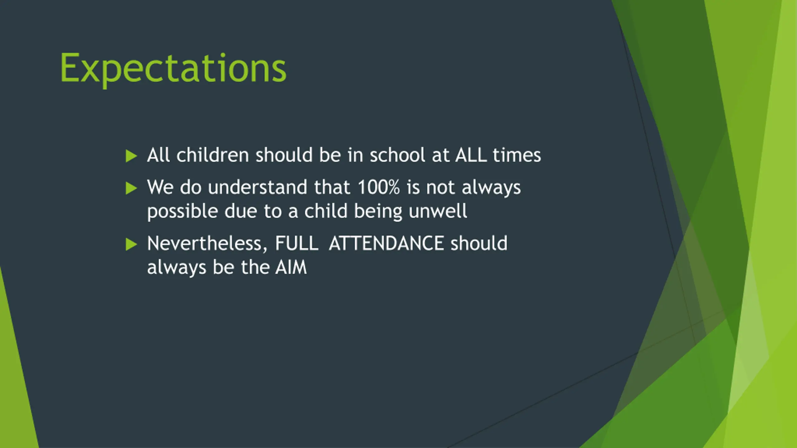 Expectations All children should be in school at ALL times We do understand that 100% is not always possible due to a child being unwell Nevertheless, FULL ATTENDANCE should always be the AIM