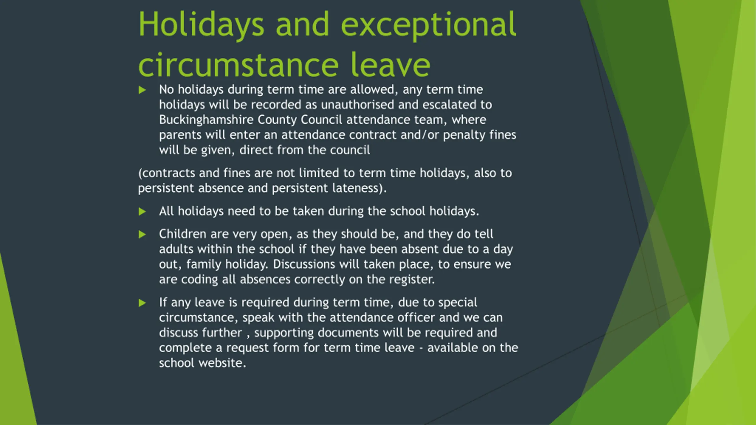 Holidays and exceptional circumstance leave No holidays during term time are allowed, any term time holidays will be recorded as unauthorised and escalated to Buckinghamshire County Council attendance team, where parents will enter an attendance contract and/or penalty fines will be given, direct from the council (contracts and fines are not limited to term time holidays, also to persistent absence and persistent lateness). All holidays need to be taken during the school holidays. Children are very open, as they should be, and they do tell adults within the school if they have been absent due to a day out, family holiday. Discussions will taken place, to ensure we are coding all absences correctly on the register. If any leave is required during term time, due to special circumstance, speak with the attendance officer and we can discuss further , supporting documents will be required and complete a request form for term time leave - available on the school website.