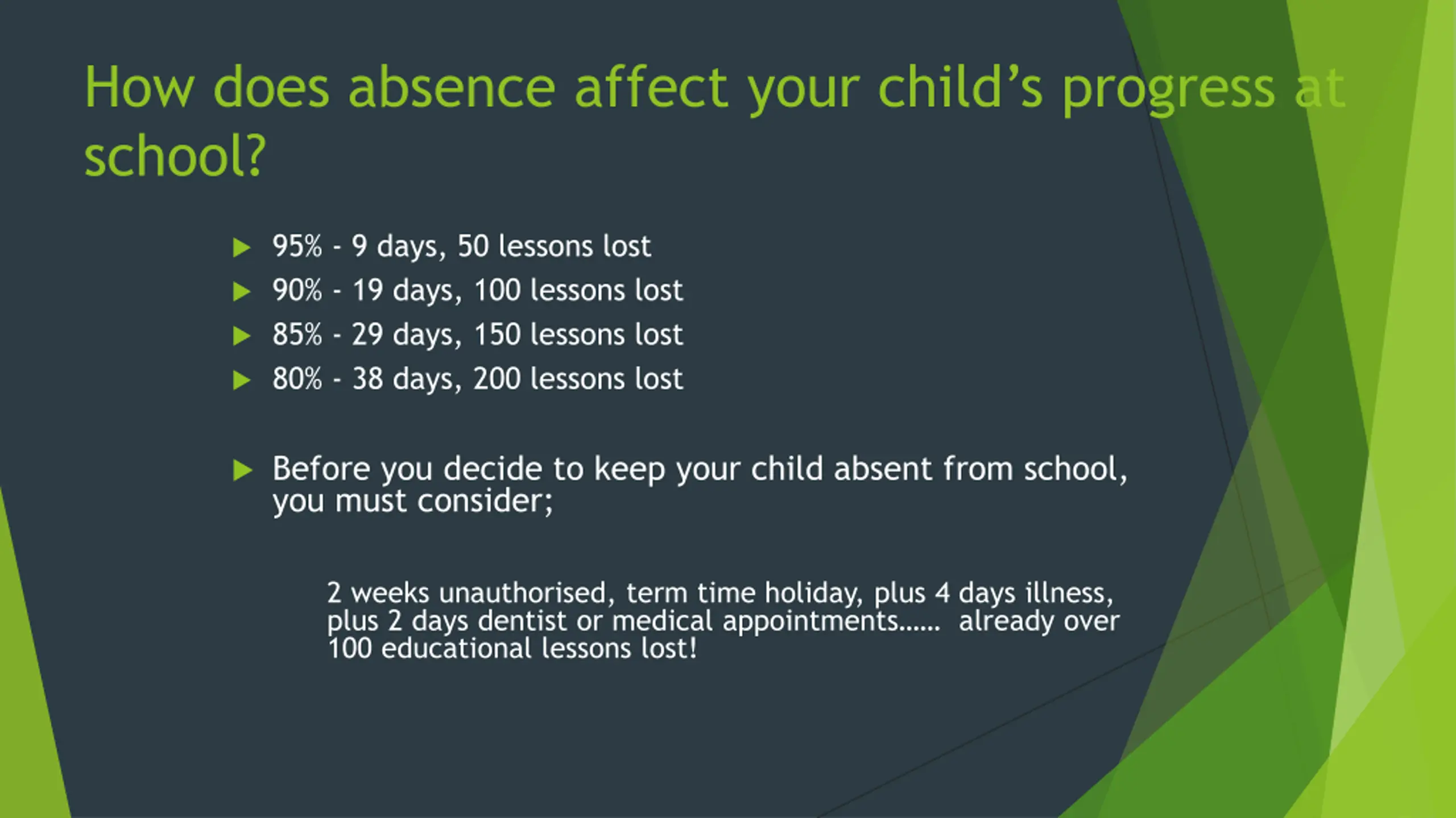 How does absence affect your childs progress at school? 95% - 9 days, 50 lessons lost 90% - 19 days, 100 lessons lost 85% - 29 days, 150 lessons lost 80% - 38 days, 200 lessons lost Before you decide to keep your child absent from school, you must consider; 2 weeks unauthorised, term time holiday, plus 4 days illness, plus 2 days dentist or medical appointments already over 100 educational lessons lost!