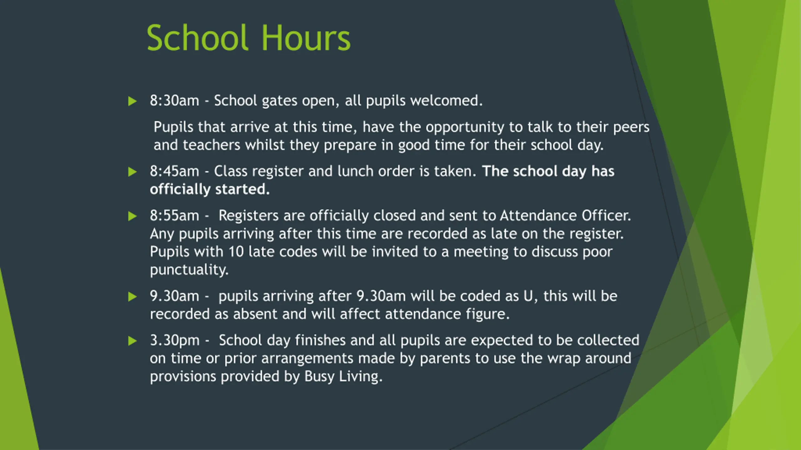 School Hours 8:30am - School gates open, all pupils welcomed. Pupils that arrive at this time, have the opportunity to talk to their peers and teachers whilst they prepare in good time for their school day. 8:45am - Class register and lunch order is taken. The school day has officially started. 8:55am - Registers are officially closed and sent to Attendance Officer. Any pupils arriving after this time are recorded as late on the register. Pupils with 10 late codes will be invited to a meeting to discuss poor punctuality. 9.30am - pupils arriving after 9.30am will be coded as U, this will be recorded as absent and will affect attendance figure. 3.30pm - School day finishes and all pupils are expected to be collected on time or prior arrangements made by parents to use the wrap around provisions provided by Busy Living.