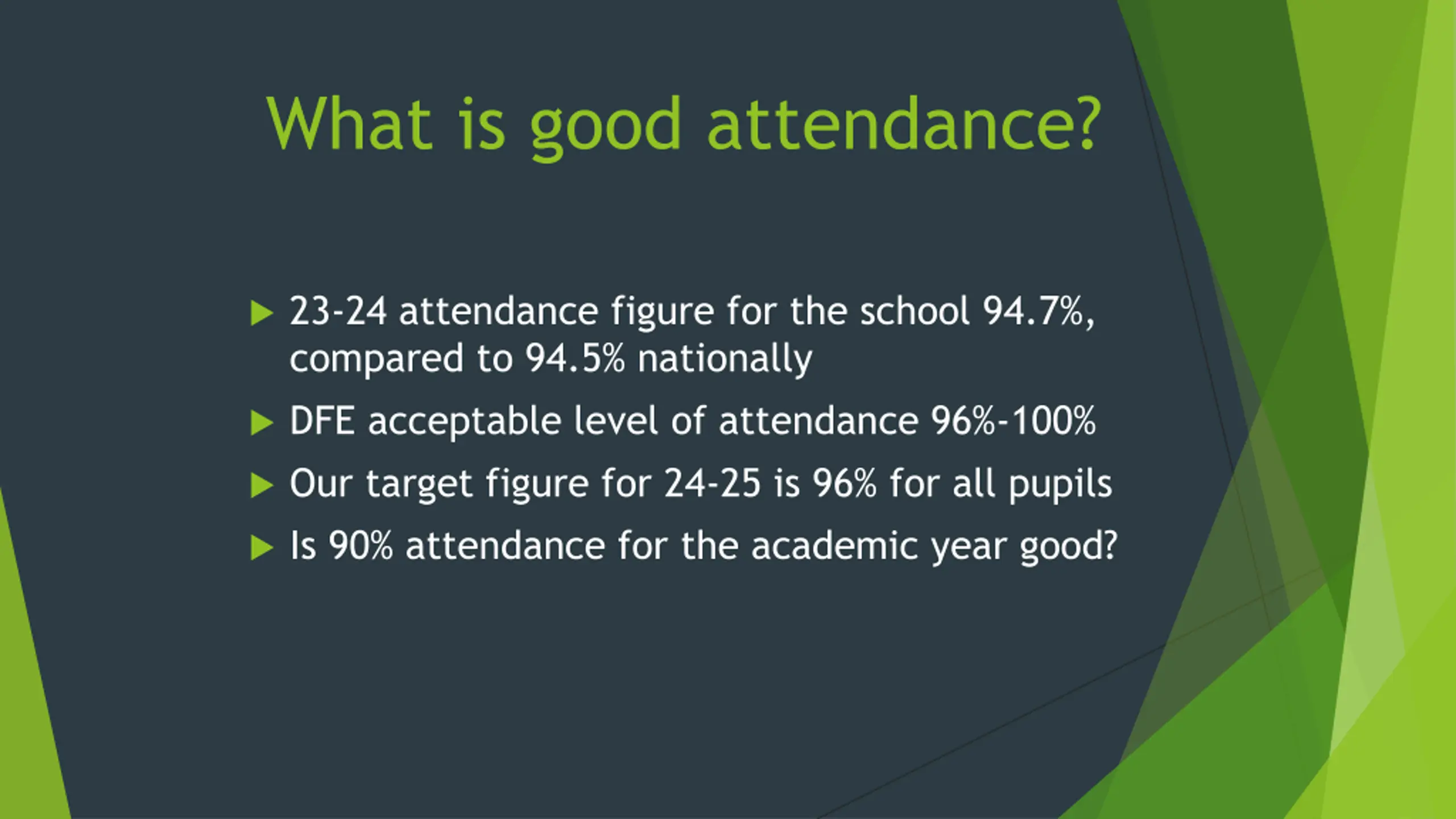 What is good attendance? 23-24 attendance figure for the school 94.7%, compared to 94.5% nationally DFE acceptable level of attendance 96%-100% Our target figure for 24-25 is 96% for all pupils Is 90% attendance for the academic year good?