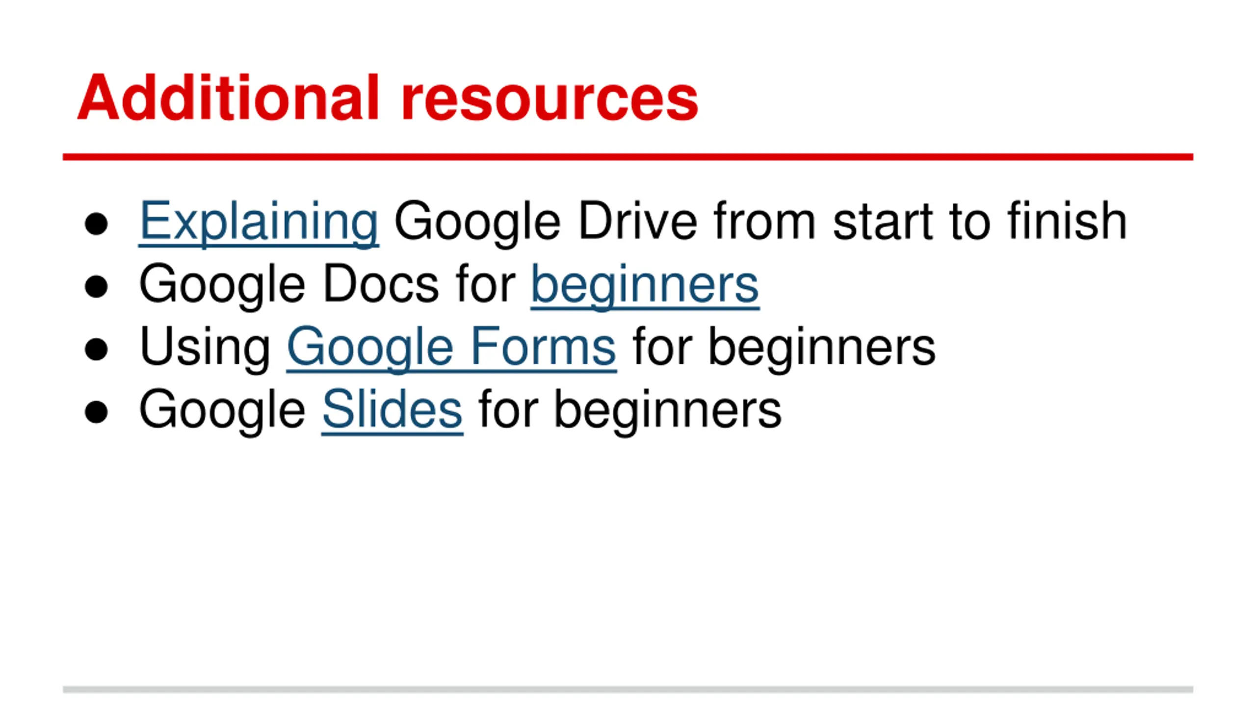 Additional resources Explaining Google Drive from start to finish Google Docs for beginners Using Google Forms for beginners Google Slides for beginners