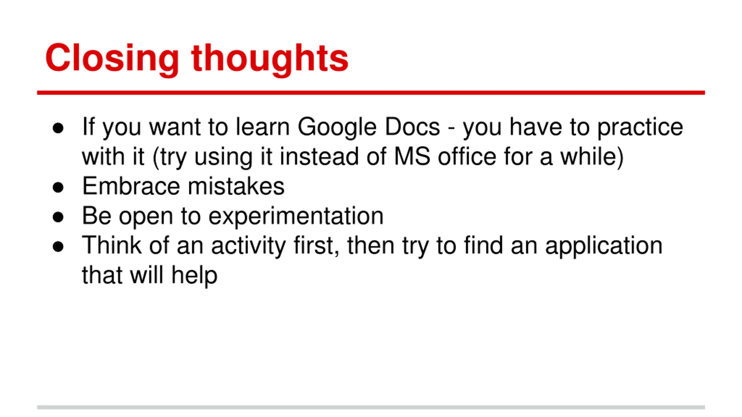 Closing thoughts If you want to learn Google Docs - you have to practice with it (try using it instead of MS office for a while) Embrace mistakes Be open to experimentation Think of an activity first, then try to find an application that will help