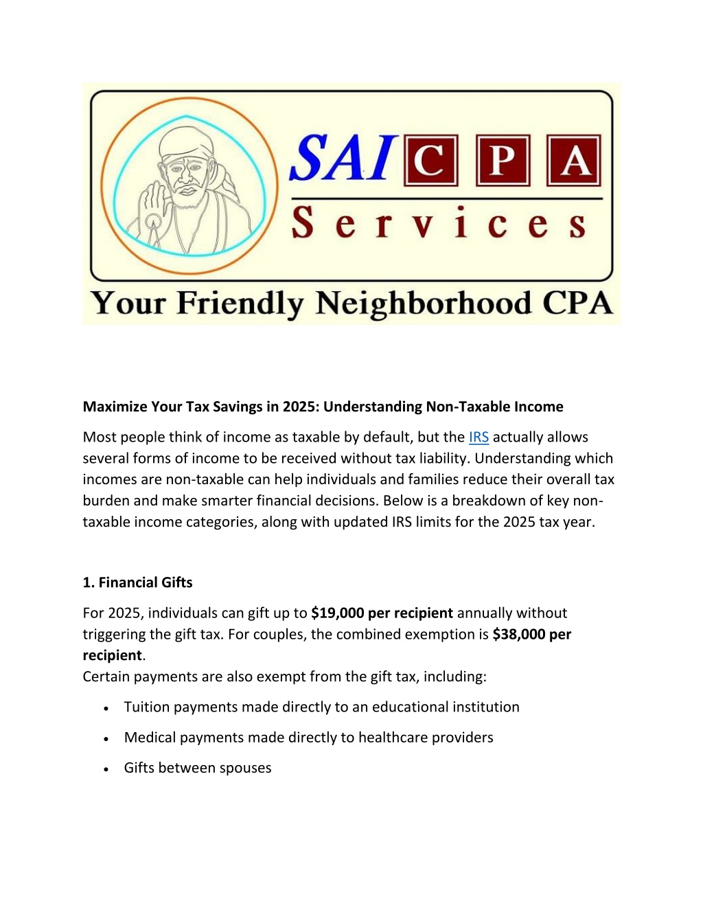 Maximize Your Tax Savings in 2025: Understanding Non-Taxable Income Most people think of income as taxable by default, but the IRS actually allows several forms of income to be received without tax liability. Understanding which incomes are non-taxable can help individuals and families reduce their overall tax burden and make smarter financial decisions. Below is a breakdown of key non- taxable income categories, along with updated IRS limits for the 2025 tax year. 1. Financial Gifts For 2025, individuals can gift up to $19,000 per recipient annually without triggering the gift tax. For couples, the combined exemption is $38,000 per recipient. Certain payments are also exempt from the gift tax, including: Tuition payments made directly to an educational institution Medical payments made directly to healthcare providers Gifts between spouses