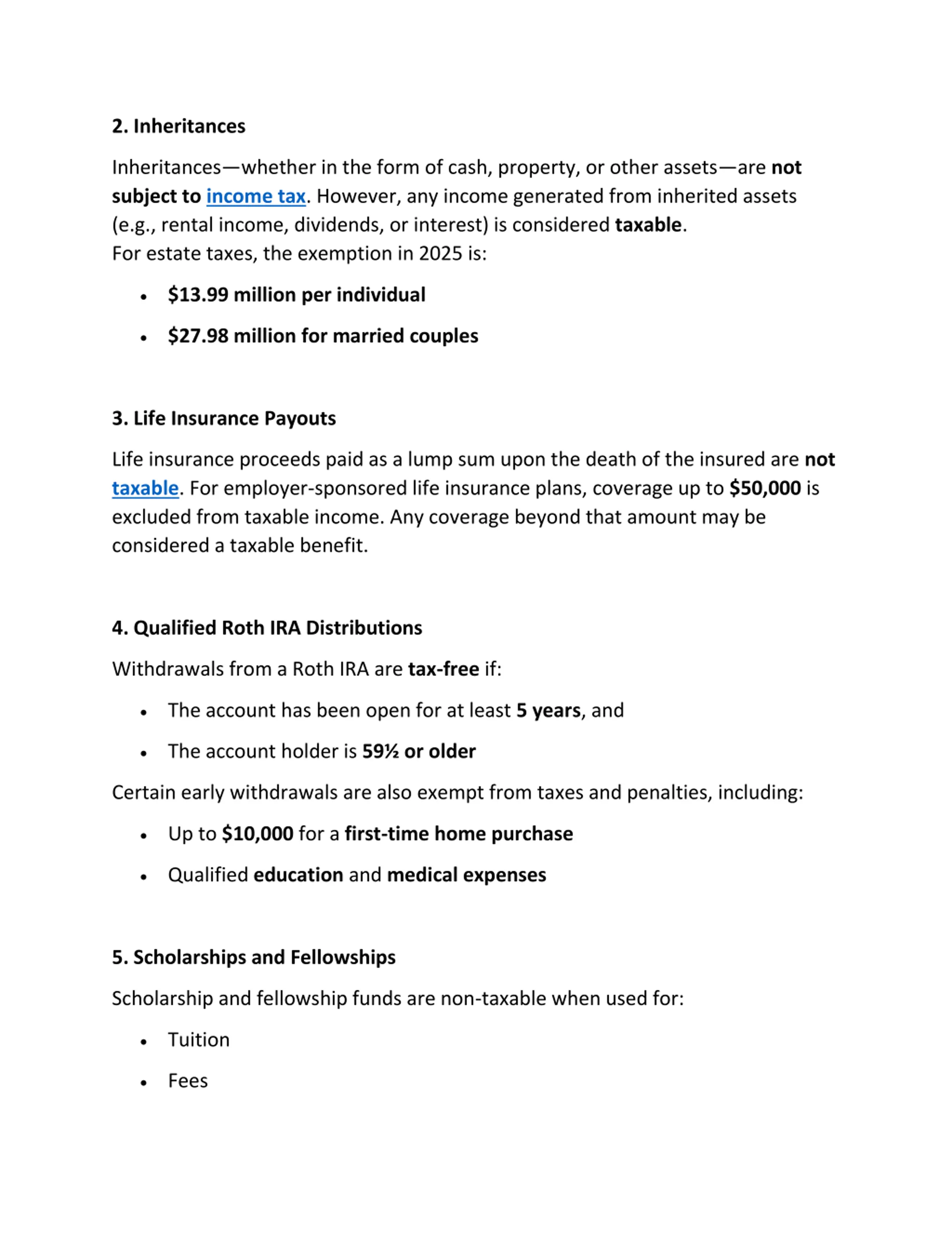2. Inheritances Inheritances whether in the form of cash, property, or other assets are not subject to income tax. However, any income generated from inherited assets (e.g., rental income, dividends, or interest) is considered taxable. For estate taxes, the exemption in 2025 is: $13.99 million per individual $27.98 million for married couples 3. Life Insurance Payouts Life insurance proceeds paid as a lump sum upon the death of the insured are not taxable. For employer-sponsored life insurance plans, coverage up to $50,000 is excluded from taxable income. Any coverage beyond that amount may be considered a taxable benefit. 4. Qualified Roth IRA Distributions Withdrawals from a Roth IRA are tax-free if: The account has been open for at least 5 years, and The account holder is 59 or older Certain early withdrawals are also exempt from taxes and penalties, including: Up to $10,000 for a first-time home purchase Qualified education and medical expenses 5. Scholarships and Fellowships Scholarship and fellowship funds are non-taxable when used for: Tuition Fees