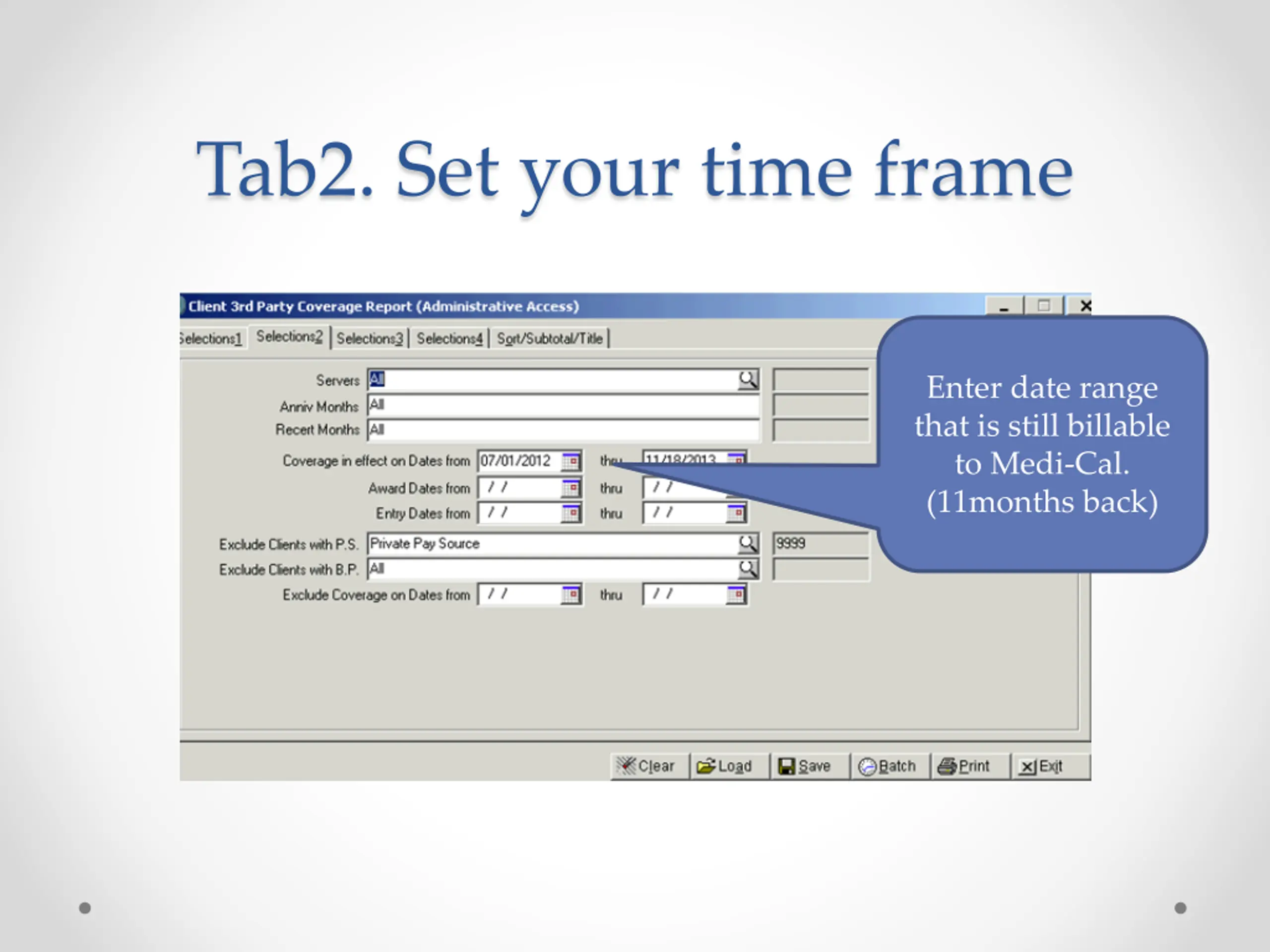 Tab2. Set your time frame Enter date range that is still billable to Medi-Cal. (11months back)