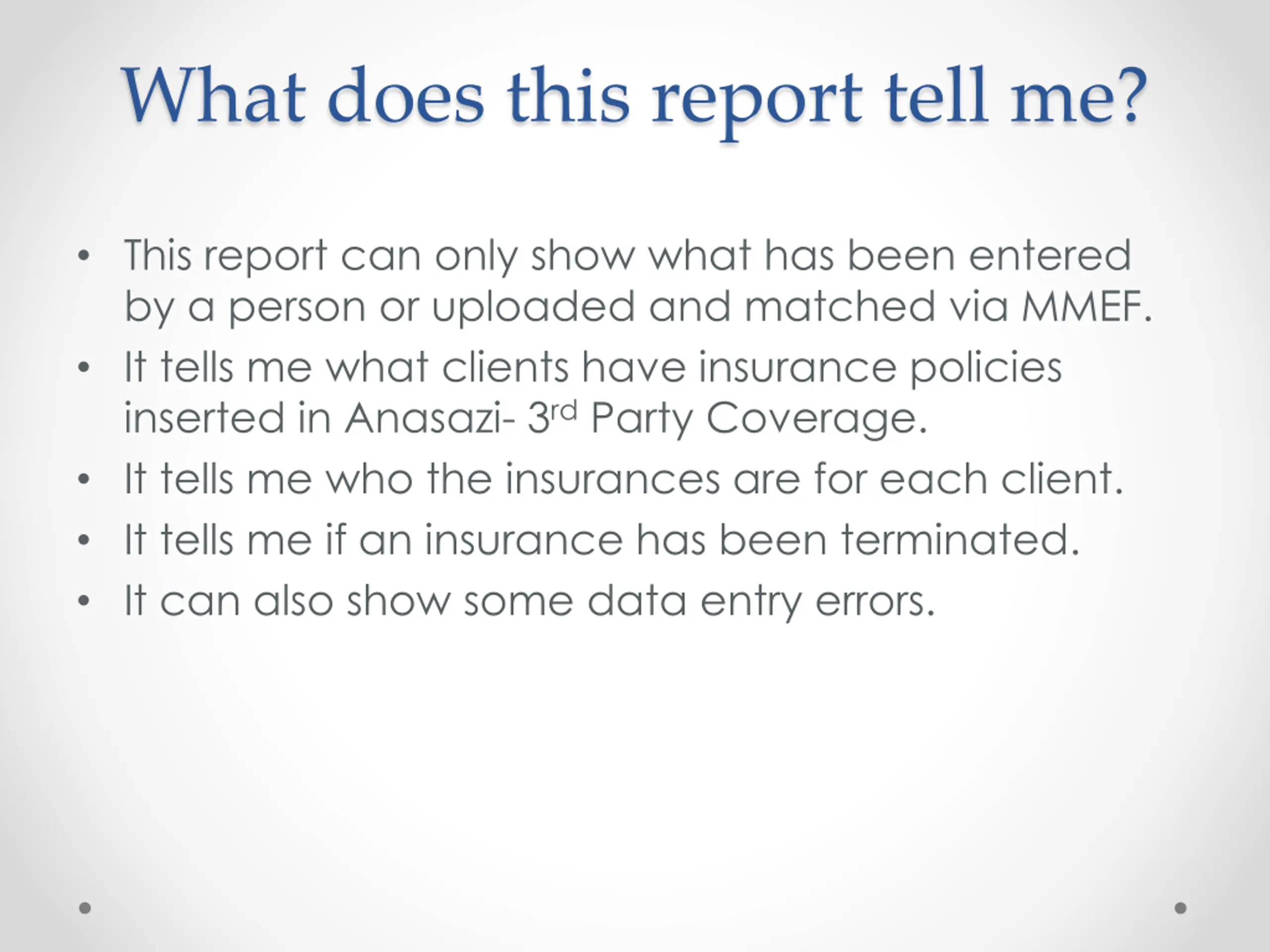 What does this report tell me? This report can only show what has been entered by a person or uploaded and matched via MMEF. It tells me what clients have insurance policies inserted in Anasazi- 3rdParty Coverage. It tells me who the insurances are for each client. It tells me if an insurance has been terminated. It can also show some data entry errors.