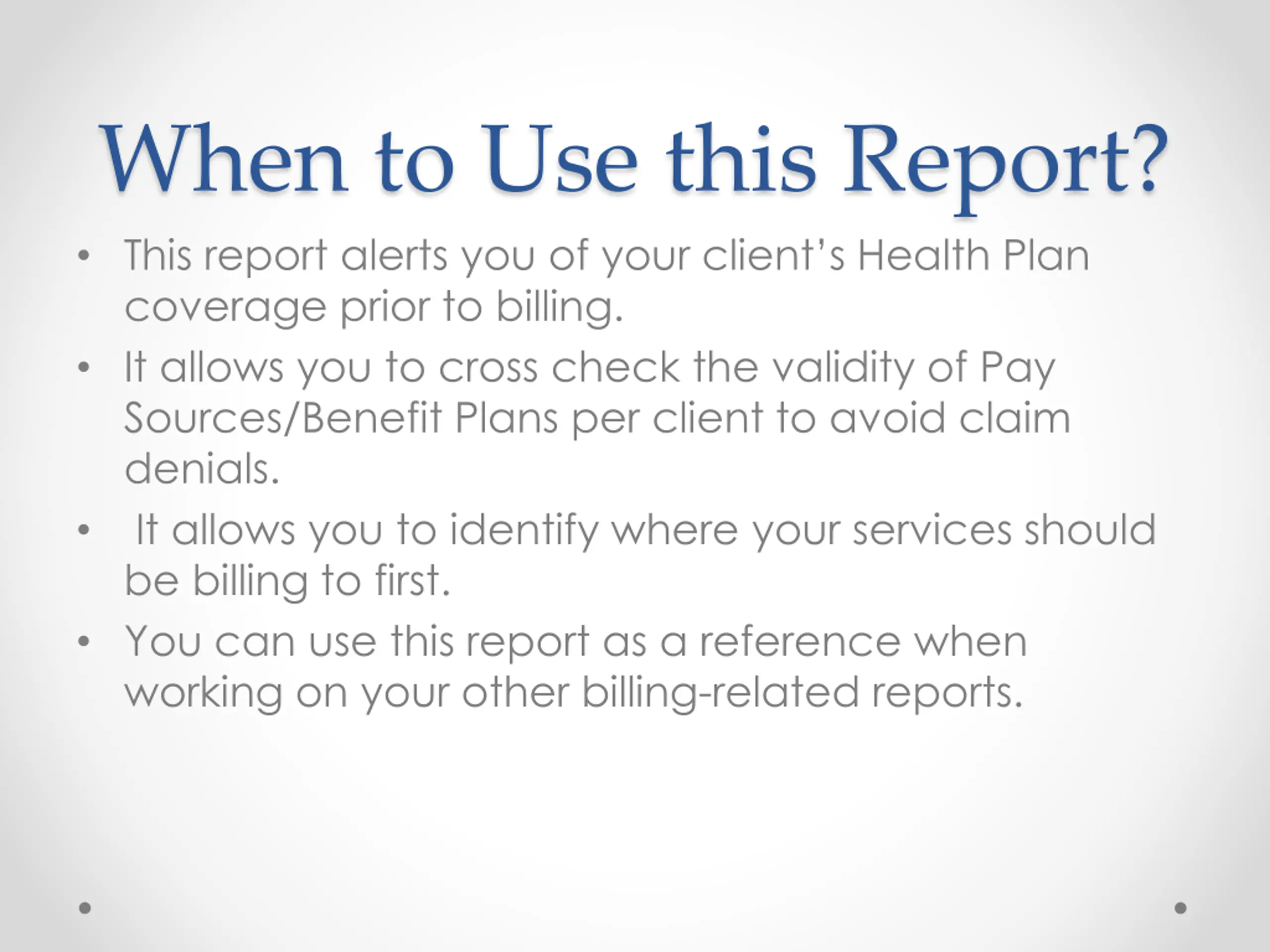 When to Use this Report? This report alerts you of your client s Health Plan coverage prior to billing. It allows you to cross check the validity of Pay Sources/Benefit Plans per client to avoid claim denials. It allows you to identify where your services should be billing to first. You can use this report as a reference when working on your other billing-related reports.