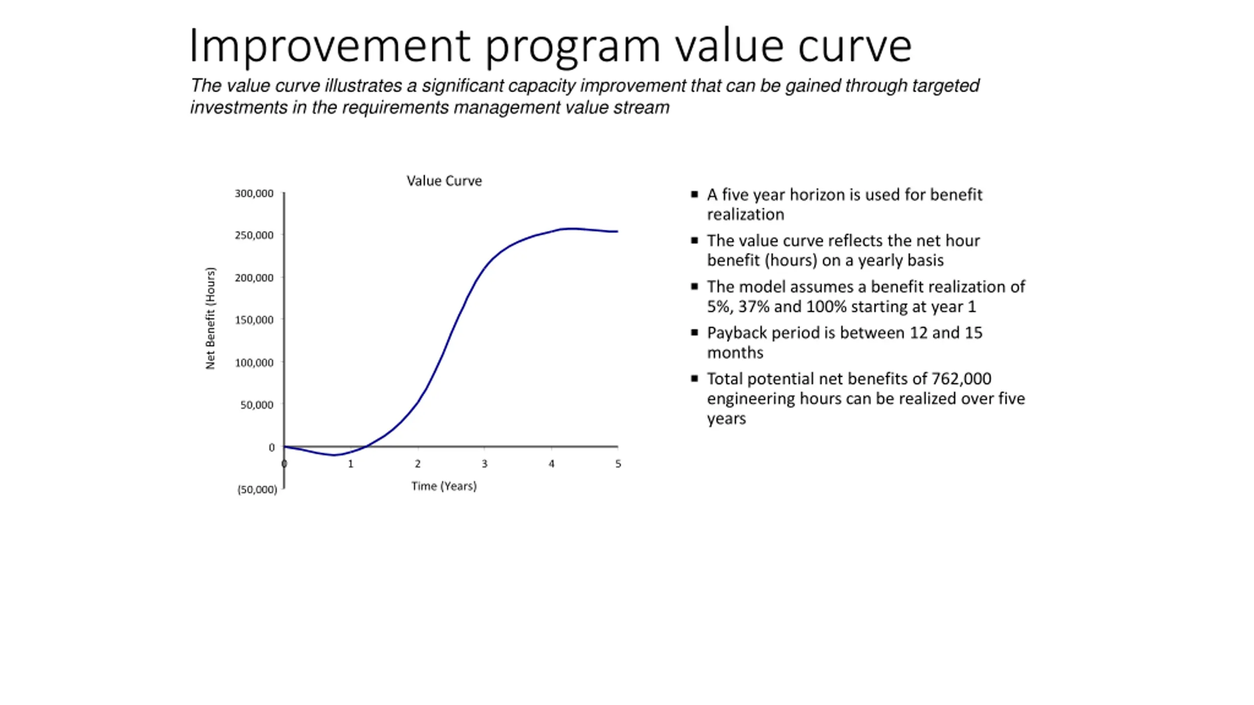 Improvement program value curve The value curve illustrates a significant capacity improvement that can be gained through targeted investments in the requirements management value stream Value Curve A five year horizon is used for benefit realization The value curve reflects the net hour benefit (hours) on a yearly basis The model assumes a benefit realization of 5%, 37% and 100% starting at year 1 Payback period is between 12 and 15 months Total potential net benefits of 762,000 engineering hours can be realized over five years 300,000 250,000 Net Benefit (Hours) 200,000 150,000 100,000 50,000 0 0 1 2 3 4 5 Time (Years) (50,000)