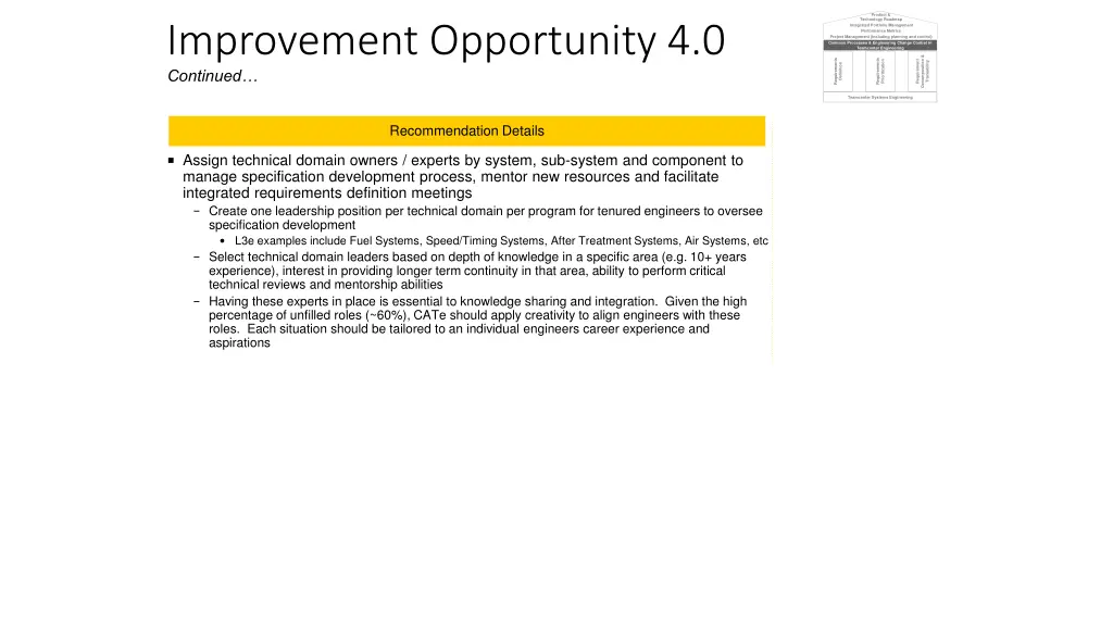 Product & Technology Roadmap Integrated Portfolio Management Performance Metrics Project Management (including planning and control) Improvement Opportunity 4.0 Continued Common Processes & Engineering Change Control in Teamcenter Engineering Decomposition & Requirements Requirements Requirement Prioritization Traceability Definition Teamcenter Systems Engineering Recommendation Details Assign technical domain owners / experts by system, sub-system and component to manage specification development process, mentor new resources and facilitate integrated requirements definition meetings Create one leadership position per technical domain per program for tenured engineers to oversee specification development L3e examples include Fuel Systems, Speed/Timing Systems, After Treatment Systems, Air Systems, etc Select technical domain leaders based on depth of knowledge in a specific area (e.g. 10+ years experience), interest in providing longer term continuity in that area, ability to perform critical technical reviews and mentorship abilities Having these experts in place is essential to knowledge sharing and integration. Given the high percentage of unfilled roles (~60%), CATe should apply creativity to align engineers with these roles. Each situation should be tailored to an individual engineers career experience and aspirations