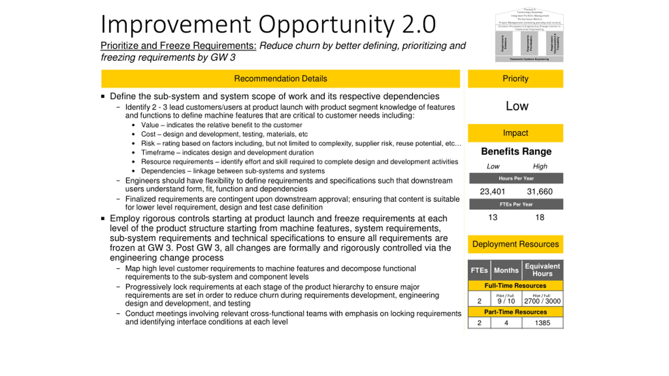 Product & Technology Roadmap Integrated Portfolio Management Performance Metrics Project Management (including planning and control) Improvement Opportunity 2.0 Common Processes & Engineering Change Control in Teamcenter Engineering Decomposition & Requirements Requirements Requirement Prioritization Traceability Definition Prioritize and Freeze Requirements: Reduce churn by better defining, prioritizing and freezing requirements by GW 3 Teamcenter Systems Engineering Recommendation Details Priority Define the sub-system and system scope of work and its respective dependencies Identify 2 - 3 lead customers/users at product launch with product segment knowledge of features and functions to define machine features that are critical to customer needs including: Value indicates the relative benefit to the customer Cost design and development, testing, materials, etc Risk rating based on factors including, but not limited to complexity, supplier risk, reuse potential, etc Timeframe indicates design and development duration Resource requirements identify effort and skill required to complete design and development activities Dependencies linkage between sub-systems and systems Engineers should have flexibility to define requirements and specifications such that downstream users understand form, fit, function and dependencies Finalized requirements are contingent upon downstream approval; ensuring that content is suitable for lower level requirement, design and test case definition Employ rigorous controls starting at product launch and freeze requirements at each level of the product structure starting from machine features, system requirements, sub-system requirements and technical specifications to ensure all requirements are frozen at GW 3. Post GW 3, all changes are formally and rigorously controlled via the engineering change process Map high level customer requirements to machine features and decompose functional requirements to the sub-system and component levels Progressively lock requirements at each stage of the product hierarchy to ensure major requirements are set in order to reduce churn during requirements development, engineering design and development, and testing Conduct meetings involving relevant cross-functional teams with emphasis on locking requirements and identifying interface conditions at each level Low Impact Benefits Range Low High Hours Per Year 23,401 31,660 FTEs Per Year 13 18 Deployment Resources Equivalent Hours FTEs Months Full-Time Resources Pilot / Full Pilot / Full 2 9 / 10 2700 / 3000 Part-Time Resources 4 2 1385