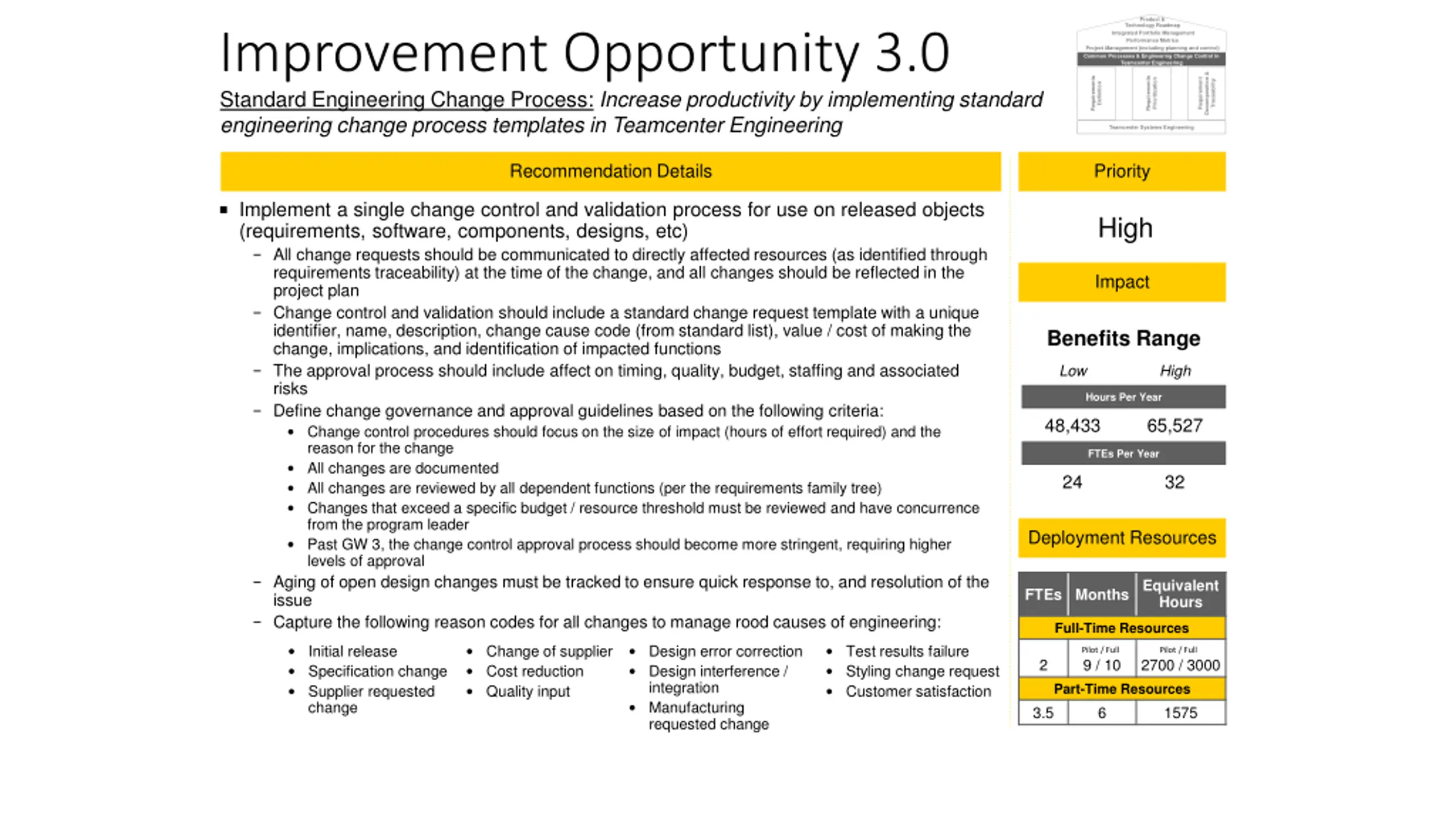 Product & Technology Roadmap Integrated Portfolio Management Performance Metrics Project Management (including planning and control) Improvement Opportunity 3.0 Standard Engineering Change Process: Increase productivity by implementing standard engineering change process templates in Teamcenter Engineering Common Processes & Engineering Change Control in Teamcenter Engineering Decomposition & Requirements Requirements Requirement Prioritization Traceability Definition Teamcenter Systems Engineering Recommendation Details Priority Implement a single change control and validation process for use on released objects (requirements, software, components, designs, etc) All change requests should be communicated to directly affected resources (as identified through requirements traceability) at the time of the change, and all changes should be reflected in the project plan Change control and validation should include a standard change request template with a unique identifier, name, description, change cause code (from standard list), value / cost of making the change, implications, and identification of impacted functions The approval process should include affect on timing, quality, budget, staffing and associated risks Define change governance and approval guidelines based on the following criteria: Change control procedures should focus on the size of impact (hours of effort required) and the reason for the change All changes are documented All changes are reviewed by all dependent functions (per the requirements family tree) Changes that exceed a specific budget / resource threshold must be reviewed and have concurrence from the program leader Past GW 3, the change control approval process should become more stringent, requiring higher levels of approval Aging of open design changes must be tracked to ensure quick response to, and resolution of the issue Capture the following reason codes for all changes to manage rood causes of engineering: High Impact Benefits Range Low High Hours Per Year 48,433 65,527 FTEs Per Year 24 32 Deployment Resources Equivalent Hours FTEs Months Full-Time Resources Initial release Specification change Supplier requested change Change of supplier Cost reduction Quality input Design error correction Design interference / integration Manufacturing requested change Test results failure Styling change request Customer satisfaction Pilot / Full Pilot / Full 2 9 / 10 2700 / 3000 Part-Time Resources 3.5 6 1575